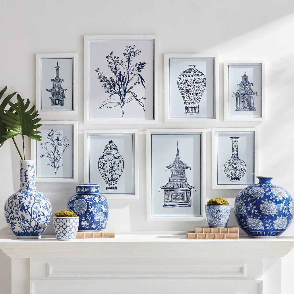 These traditional chinoiserie-inspired elements make a dynamic set of prints. Paired with a simple white wood frame. This monochromatic set of eight was carefully curated to create a stunning salon style arrangement, but can also be split up into sets for smaller spaces.