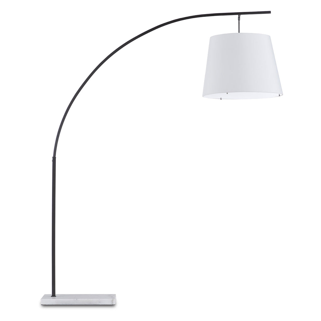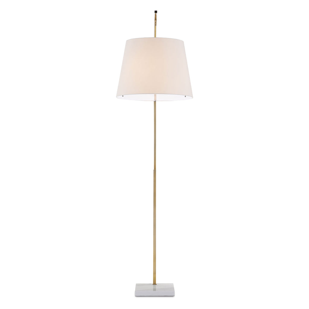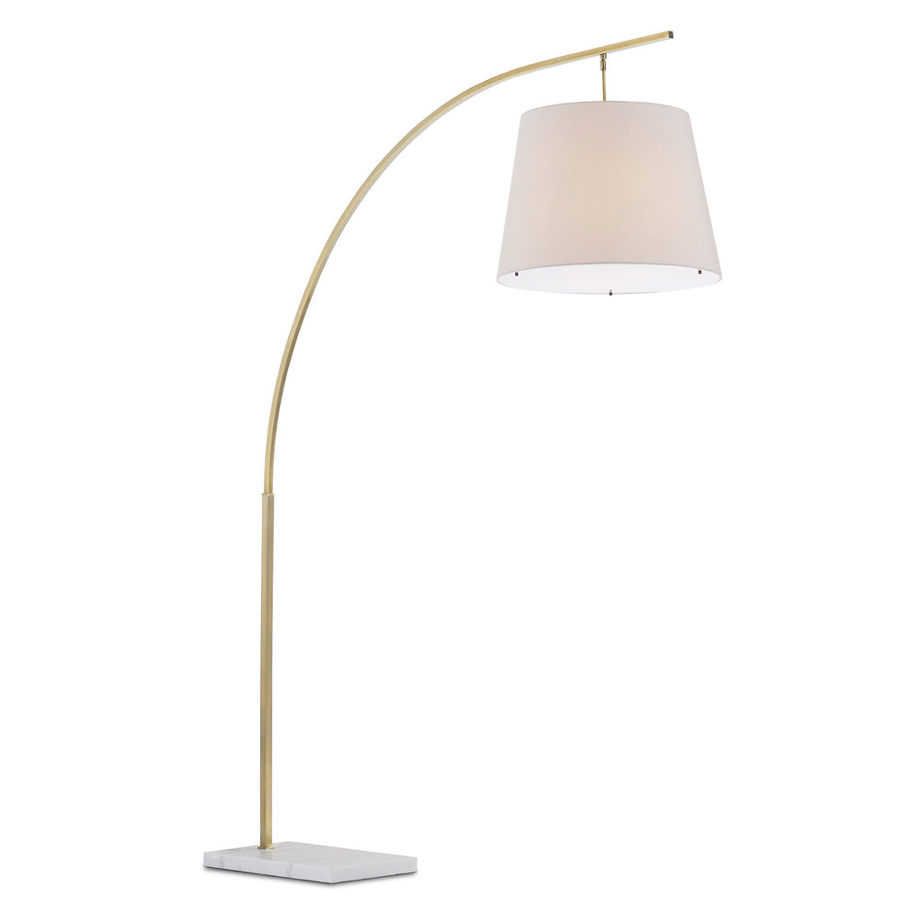 The angular arc of the stem on the Currey & Co Cloister Brass Large Floor Lamp, the way the shade dangles, and the minimal shape of its base are design details that make it an exemplar of contemporary design. The clean way the stem is fastened to the base and the pared-down lines of the white linen shade enhance the gold floor lamp’s modernity. The acrylic diffuser fastened by the petite button finial is a clever aspect to this design.