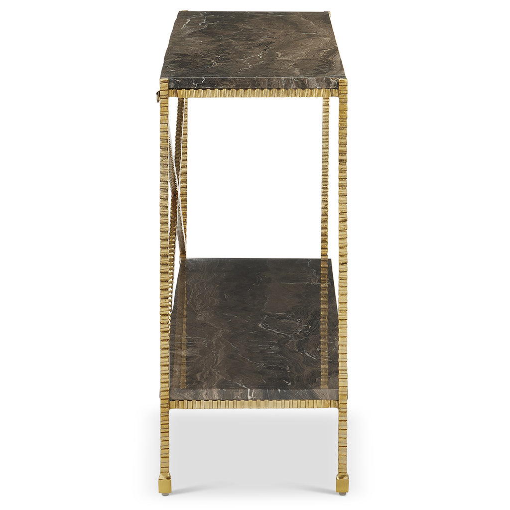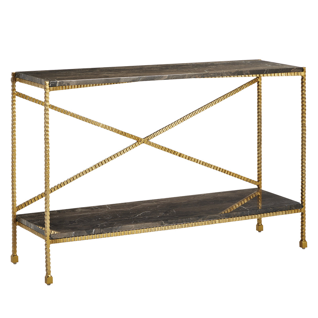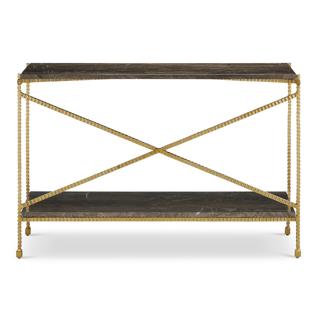Gold iron and cappuccino-colored stone come together to create the Flying Gold Marble Console Table. The X-shaped stretchers and top support are as toothy as the legs to bring this gold console table an industrial vibe, but it is also a shoe-in for a contemporary aesthetic. Design details of note are the way the feet swell and the clever way the legs culminate to embrace the brown marble top.