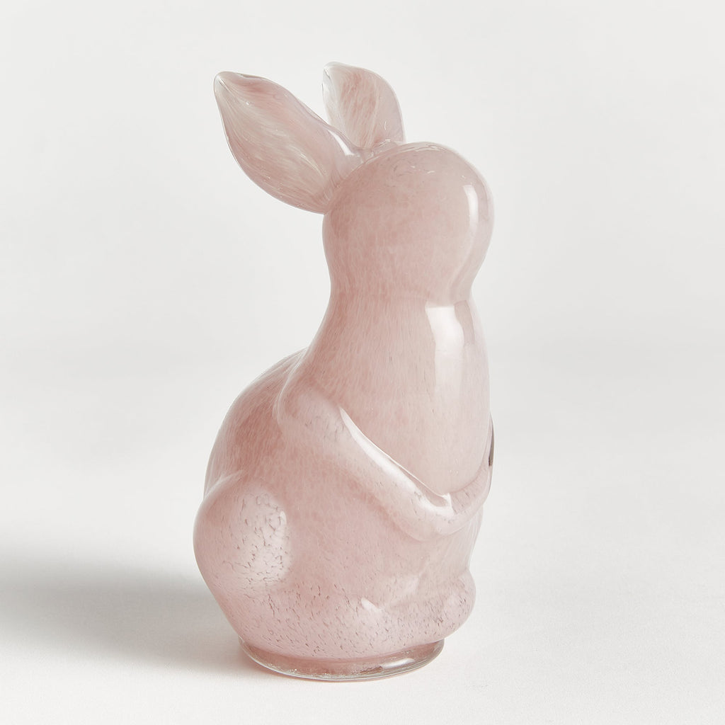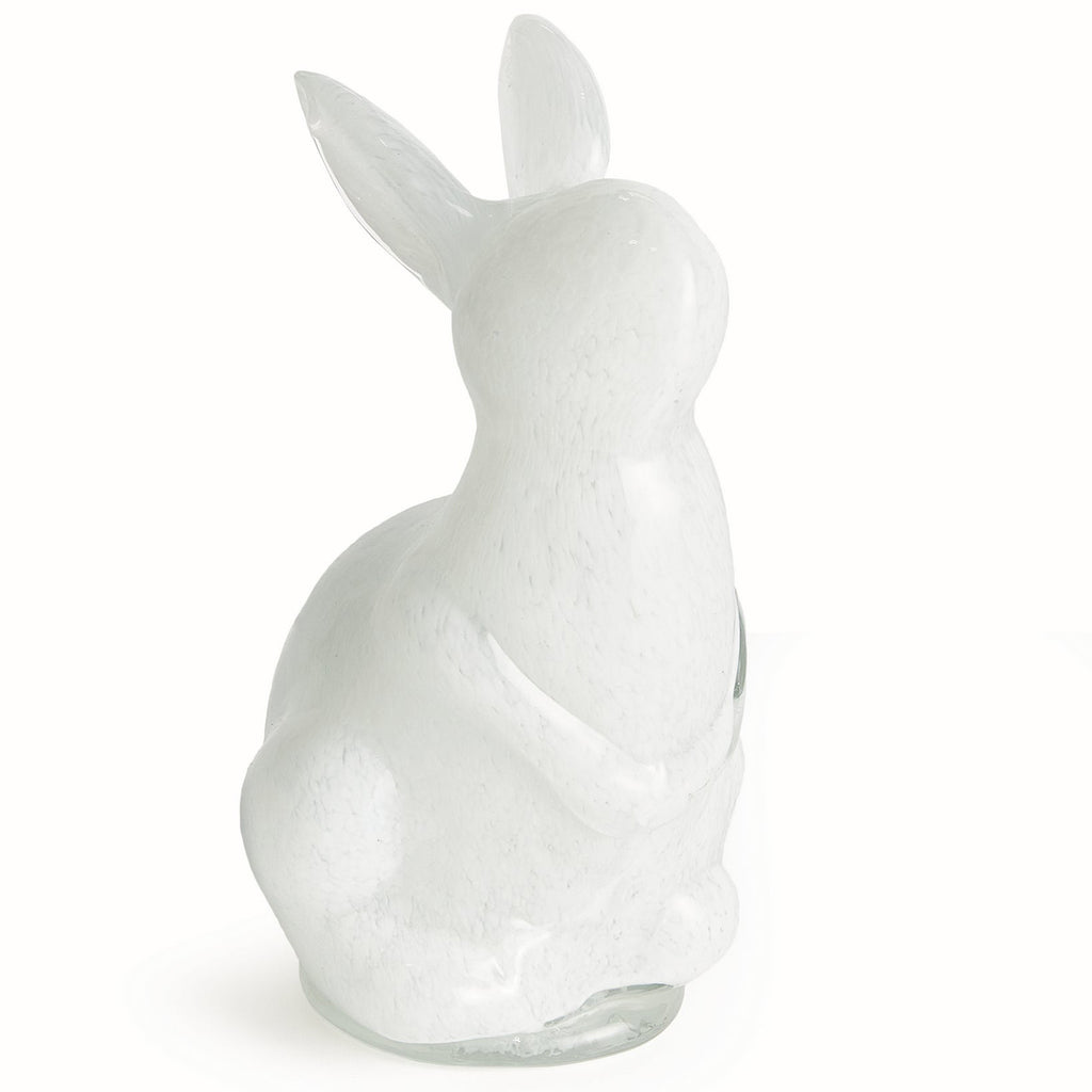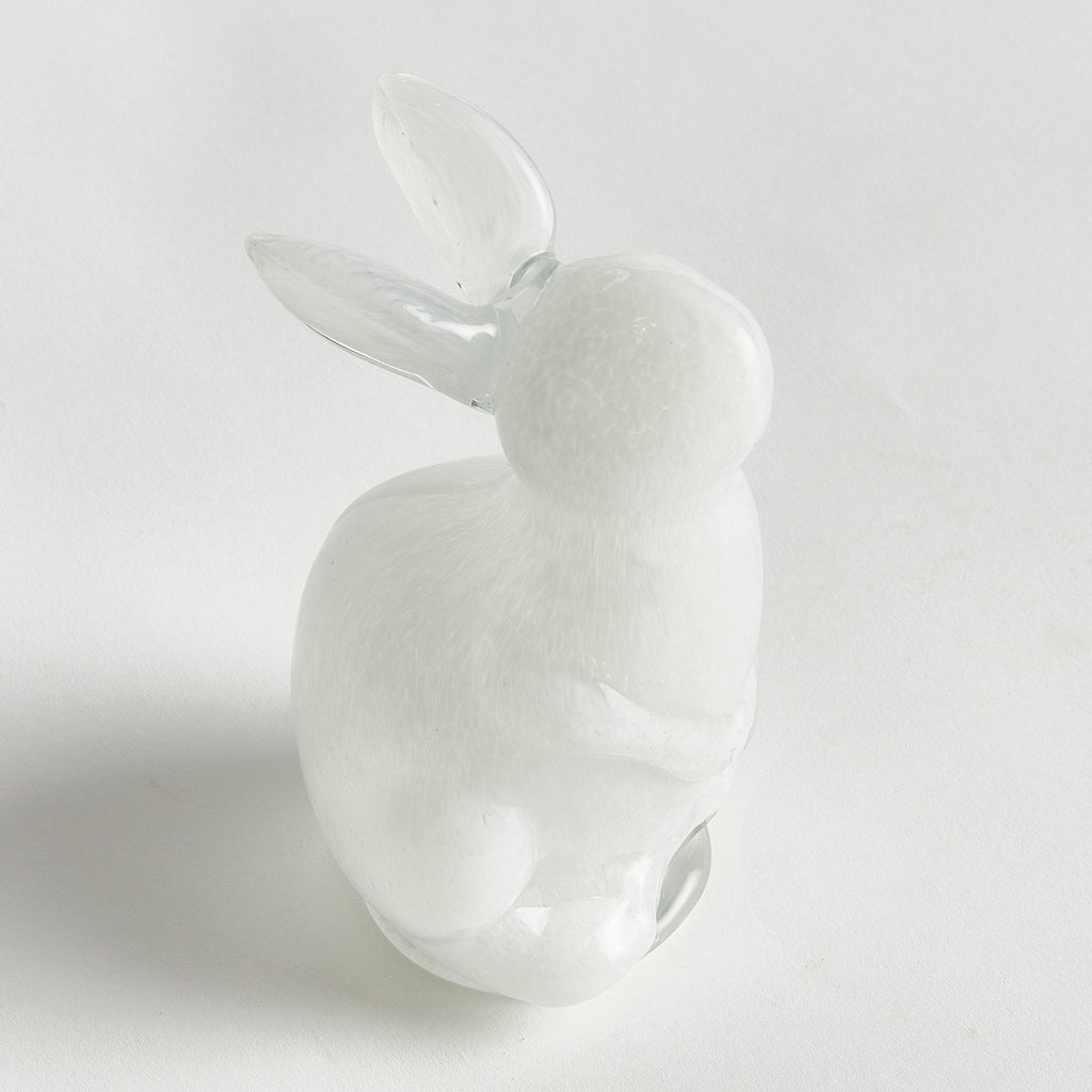 Our hand blown and molded glass bunny sculpture is simply adorable in Spring or even year round. The color is added to glass during heat process, not sprayed. A classic design in a bright white. A playful creature to adorn your side table, coffee table or ottoman.