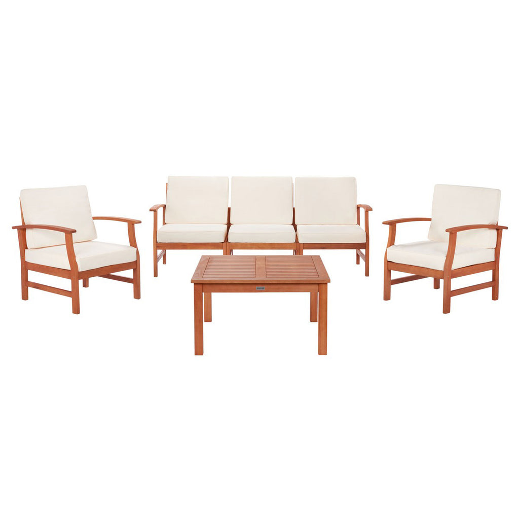 Lounge in style in every season with this luxurious 4 piece outdoor living set. Outfitted with sumptuous cushions, its expansive traditional sofa and two classic arm chairs are perfect for entertaining around its beautiful natural eucalyptus wood table. Sold as set of 4.