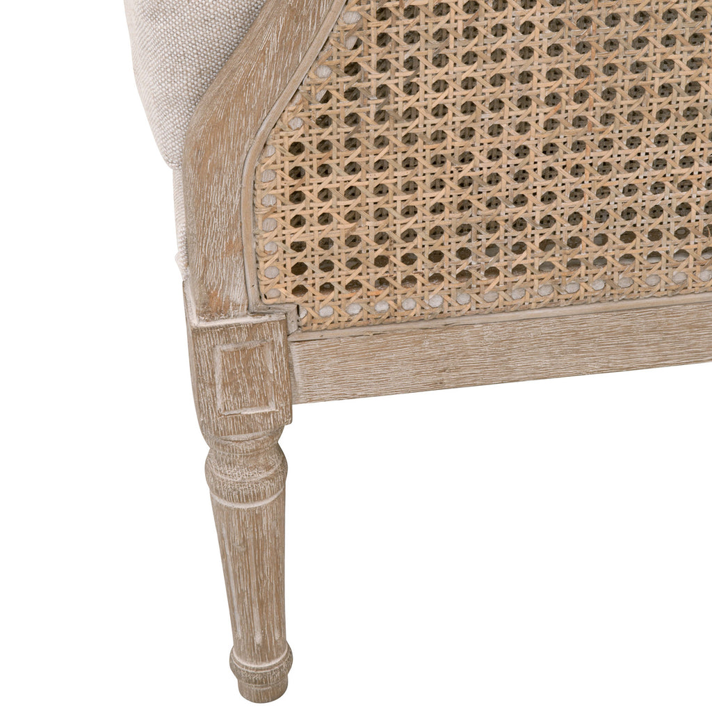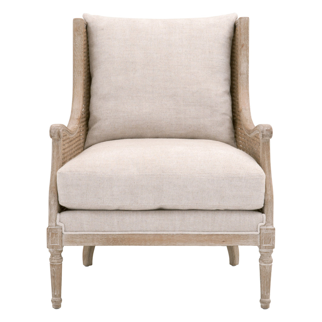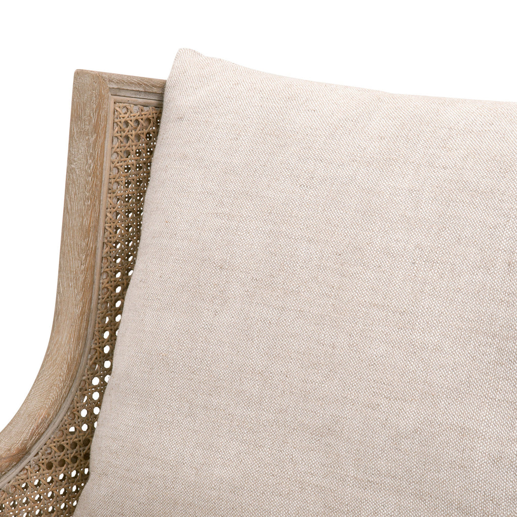 The Churchill club chair from Essentials for Living  with upholstery and a solid birch frame with natural rattan. Available in Bisque, Denim Velvet or Dark Dove Velvet.