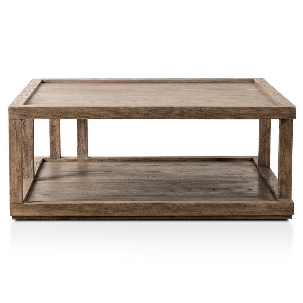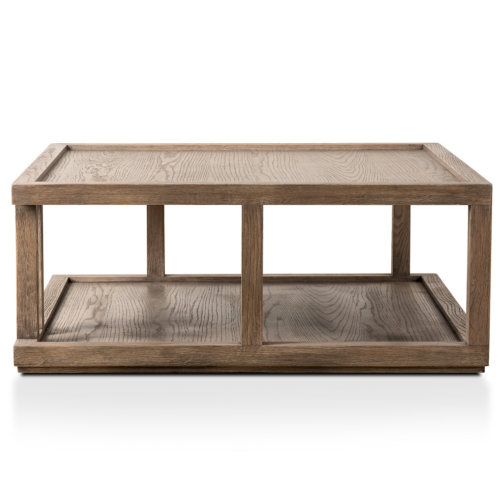 The living room centerpiece gets a geometric touch. Light-finished solid oak forms clean, mitered corners, offering two tiers of tabletop for plenty of space. Open-air styling lends a look of lightness to rustic materials.