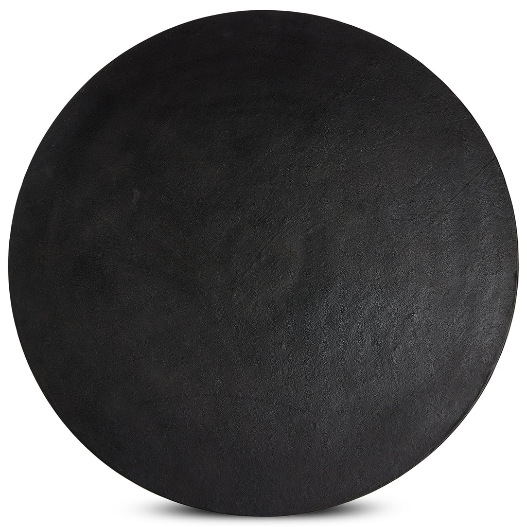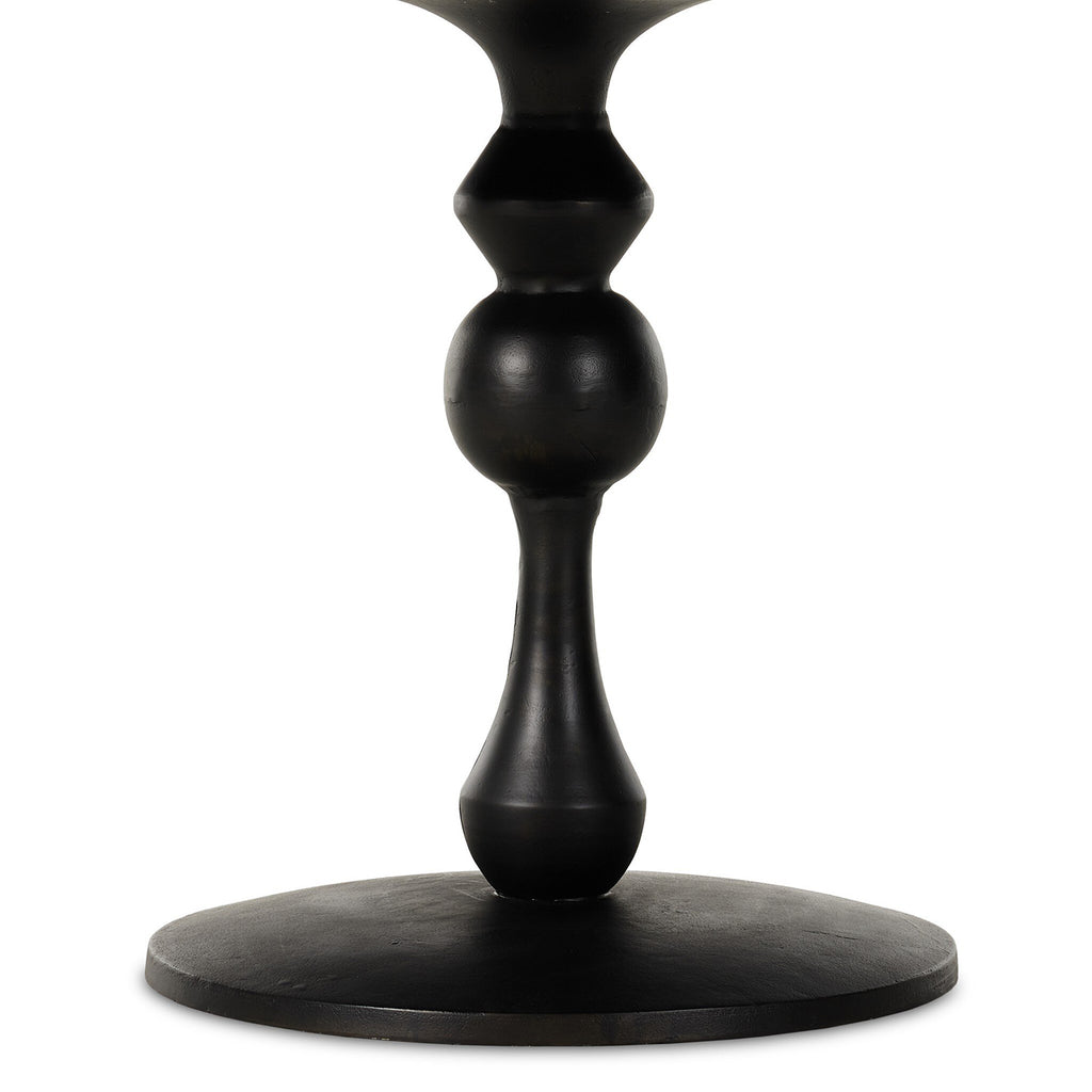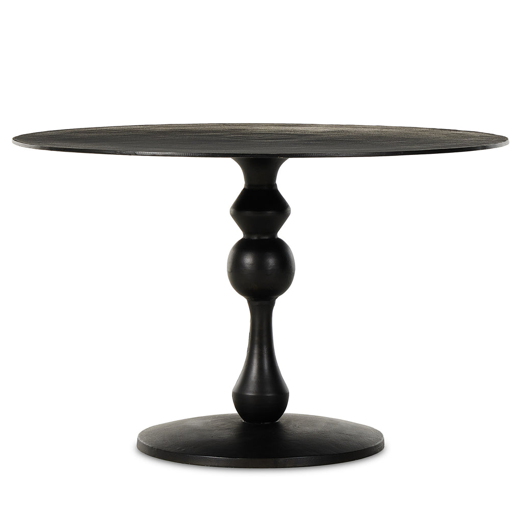 Finished in an antique black, raw aluminum shapes a bistro-style dining table with a turned, geometric look. Seats four comfortably. For use indoors or out — if styled outside, cover or bring inside during inclement weather and when not in use.