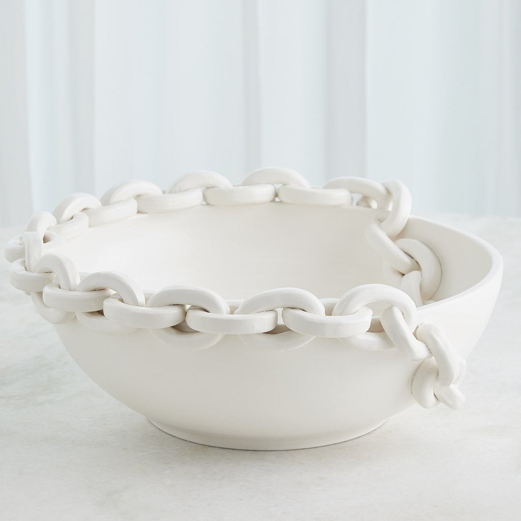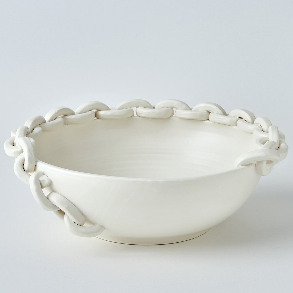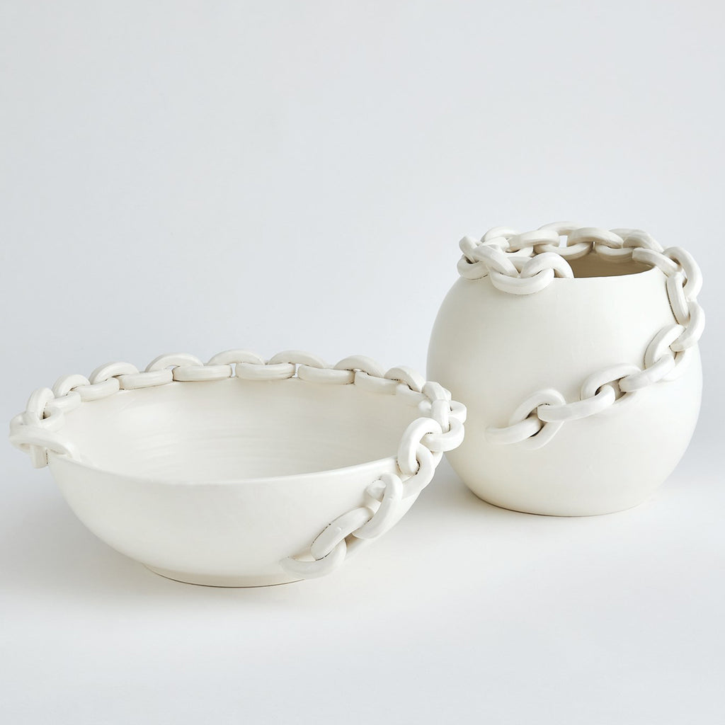 The Catena Vase and Bowl are handcrafted from Italian slip-molded ceramic. They feature a distinctive hand-applied chain detail that reflects the meaning of catena "chain" in Latin. Finished in a soft matte white, these pieces bring refined elegance to any interior.