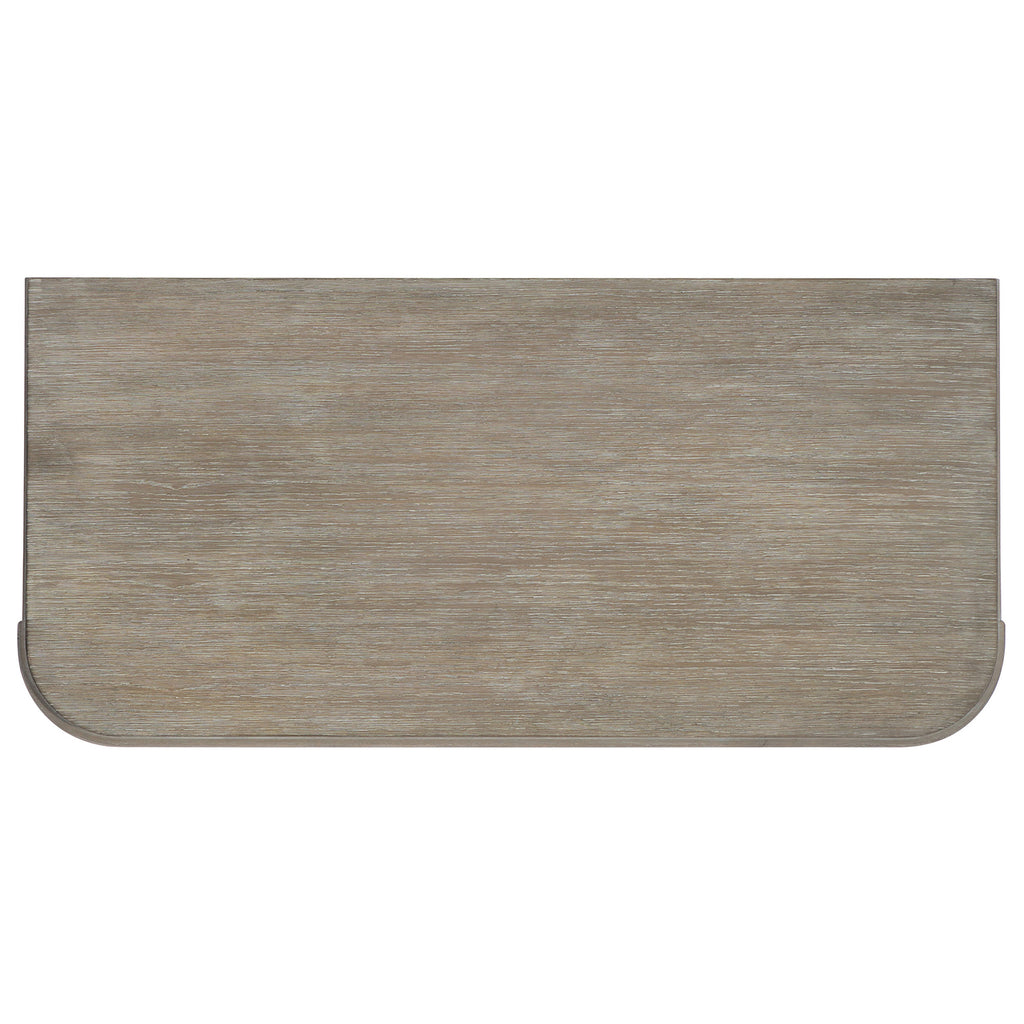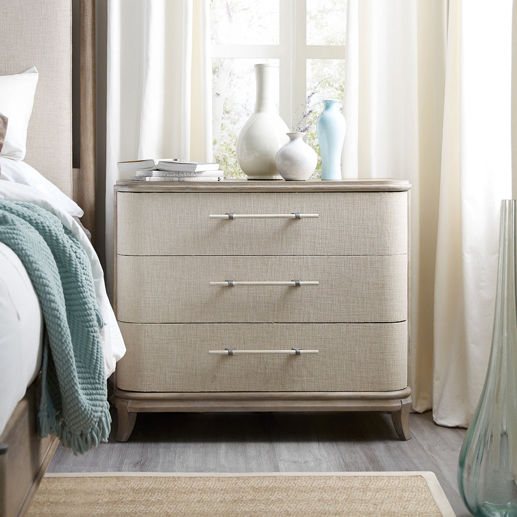In a softly rounded form, the Affinity Bachelor’s Chest combines a greige sand-blasted finish on Quartered Oak veneers with fabric-wrapped drawer fronts and cream and pewter bar pulls for a serene appeal.