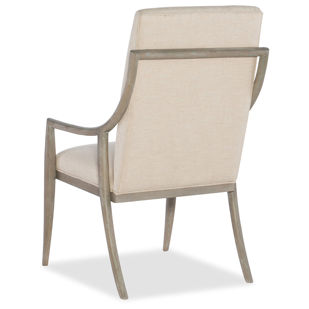 The Affinity Host Chair’s Quartered Oak Veneer frame has softly curving legs and a curved back for an inviting, soft silhouette. The greige sand-blasted finish complements the Kurtz Linen on the plush and rounded upholstered seat and back, offering a natural color palette and tactile appeal.