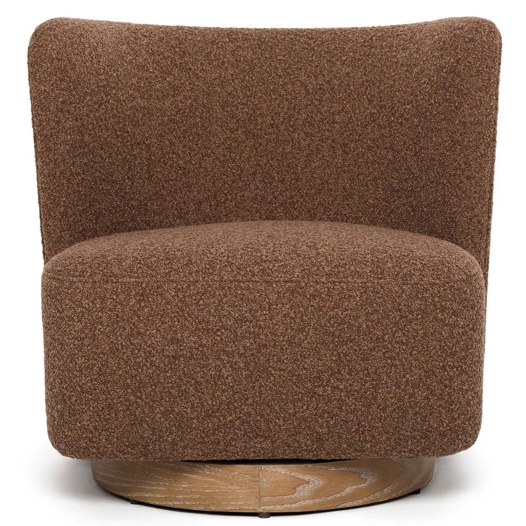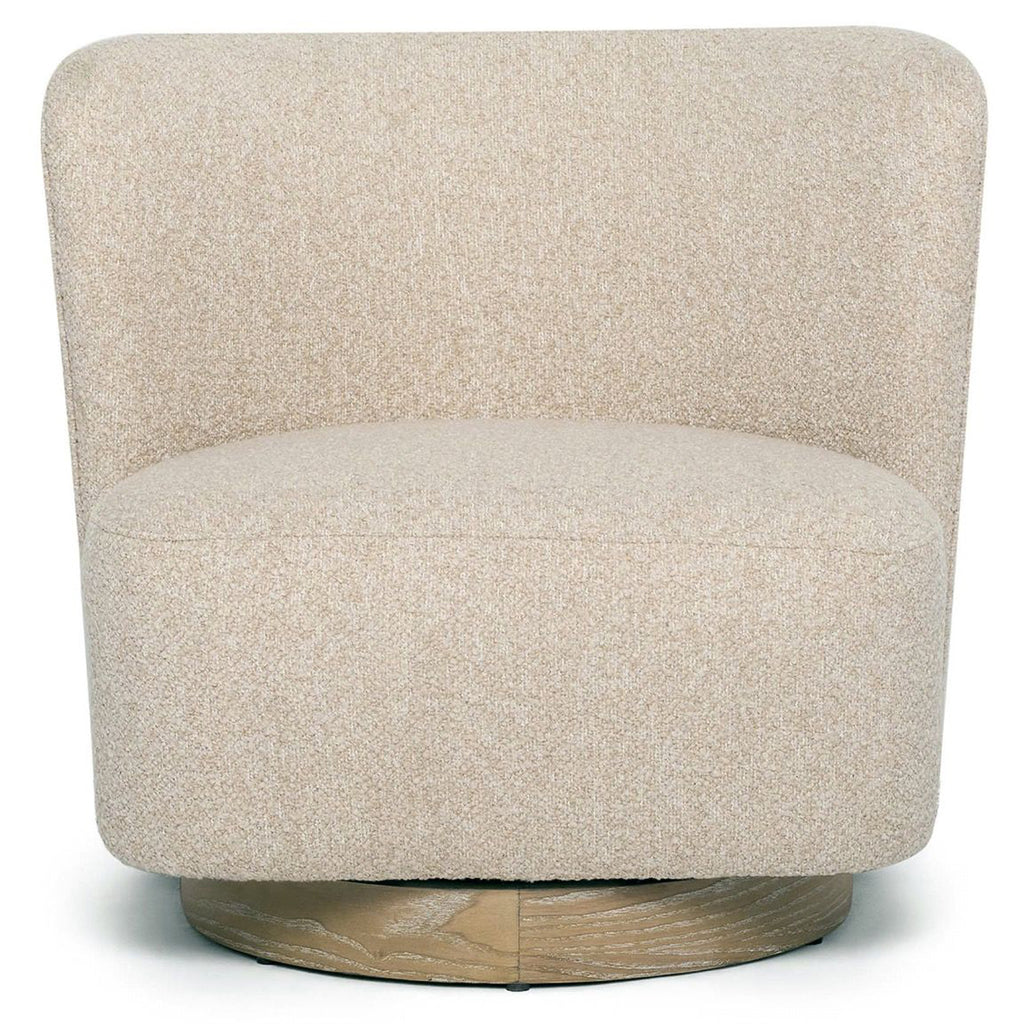 With its curved back, fabric upholstery in Baja ridge and whitewash ash base, the plush Dorian Swivel Lounge Chair beckons.