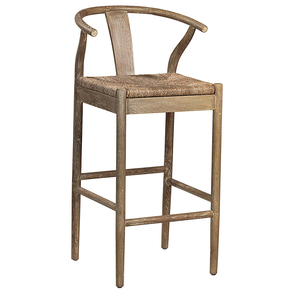 A trendy take on a classic mid-century modern favorite. This bar stool stands out with its curved, oak wood frame and wicker style seating. The woven seat adds an organic feel to the sculptural form and cutout back design. Certainly, a statement piece.