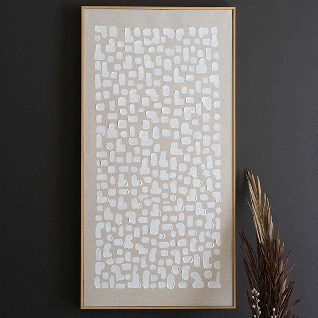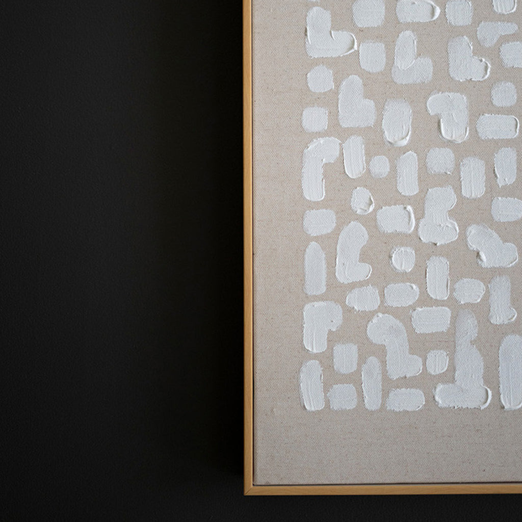 Set a soothing tone for your spa space or bedroom with this abstract khaki and white framed oil painting. Neutral tones and a pleasing pattern make this painting perfect for dark or light walls wherever you need a neutral note.