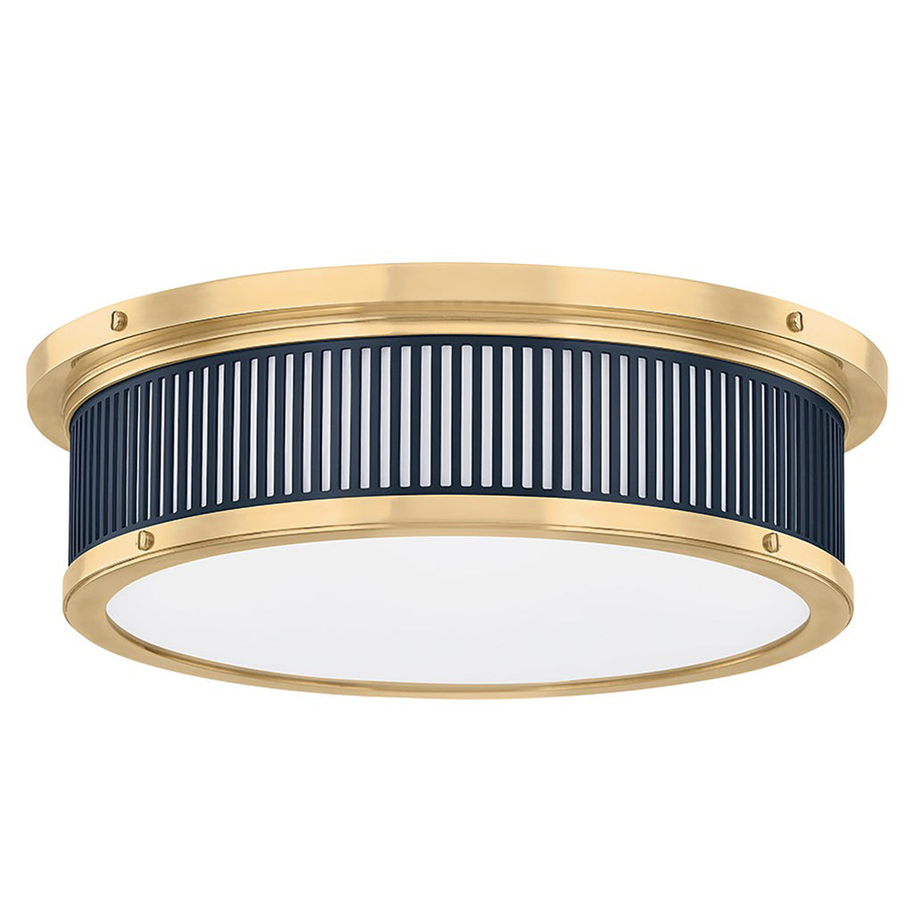 By blending classic and contemporary elements, the Mark D. Sikes x Hudson Valley Lighting Ashdown family offers a new take on sophisticated ceiling lighting. Available in both square and rounded shapes, these flush mounts feature Mark D. Sikes' signature brass screw accents and a white glass shade. The distinctive geometric perforations on the frame provide another decorative detail. Choose from an Aged Brass and Darkest Blue finish combination, or an Aged Brass and Off White pairing.