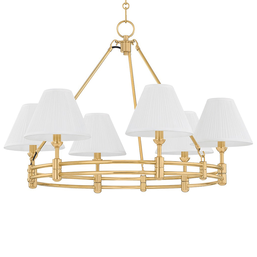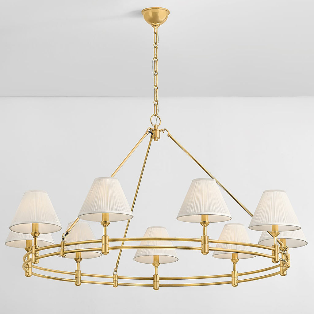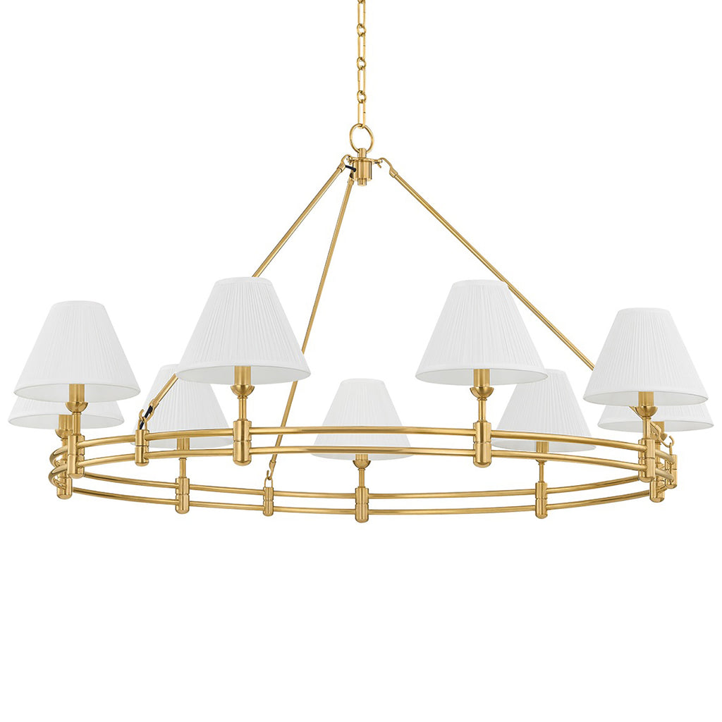 The Mark D. Sikes x Hudson Valley Lighting Howard chandelier family combines classic tiered silhouettes with clean lines. The sleek ring shape is available in three versions: a 6-light and 9-light chandelier with a single tier, and a grand 15-light chandelier with a two-tier design. Silk shades, thoughtful detailing, and well-balanced proportions make Howard a memorable centerpiece for a dining area or entryway. Available with two finish options, Aged Brass and Aged Brass and Dark Bronze.