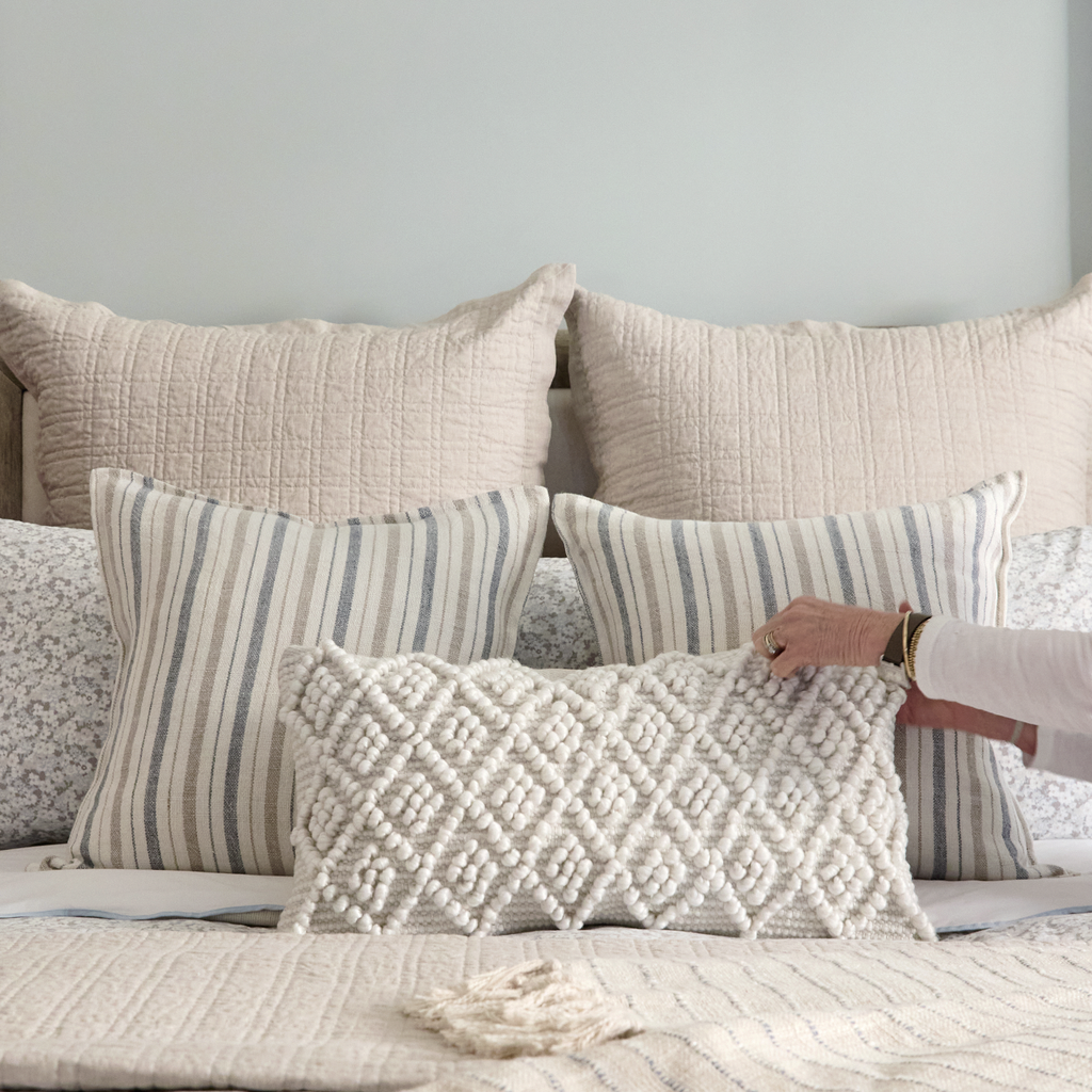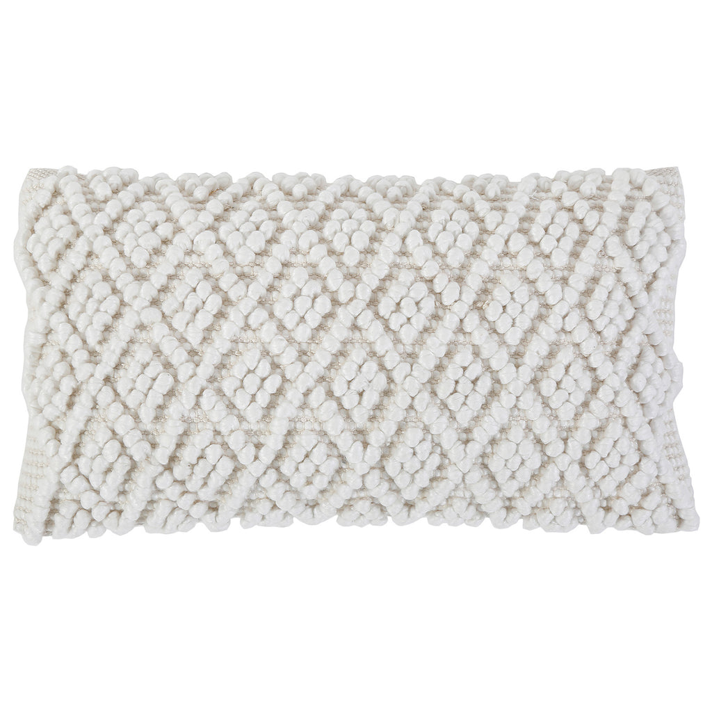 The Pom Pom at Home Coco is an handwoven pillow loomed with soft ivory looped nubs in diamond patterns.