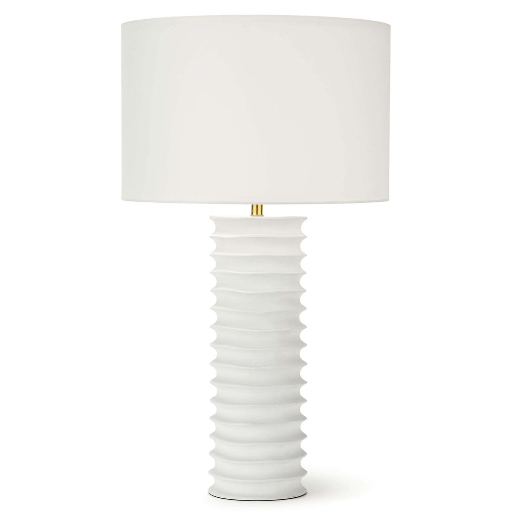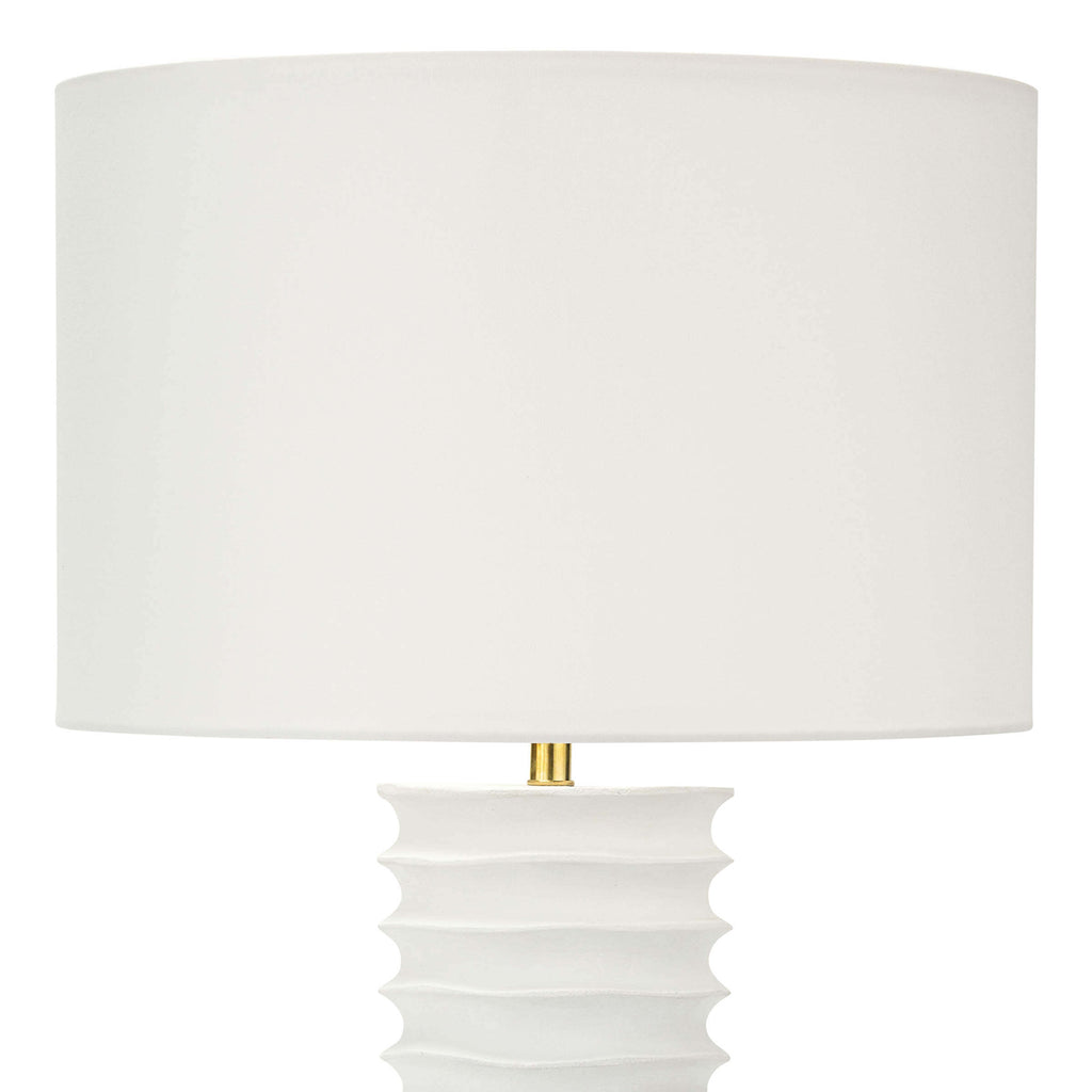 A tactile white finish on the Nabu metal column table lamp accentuates its accordion-like base. Its simple, yet artisan feel would make for a beautiful welcome in an entryway or in a pair as bedside lighting.