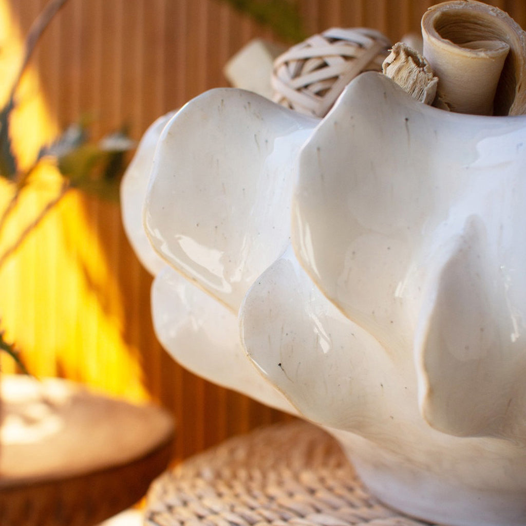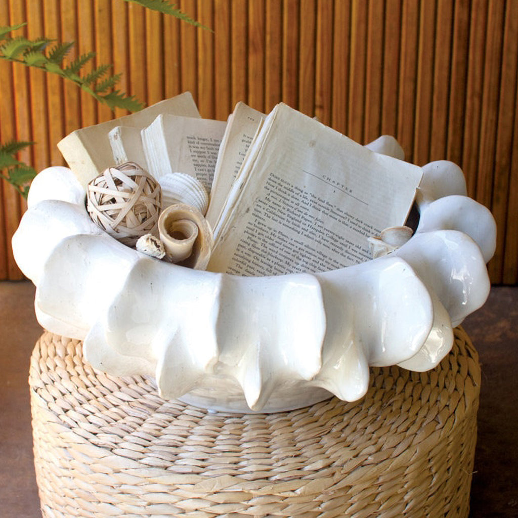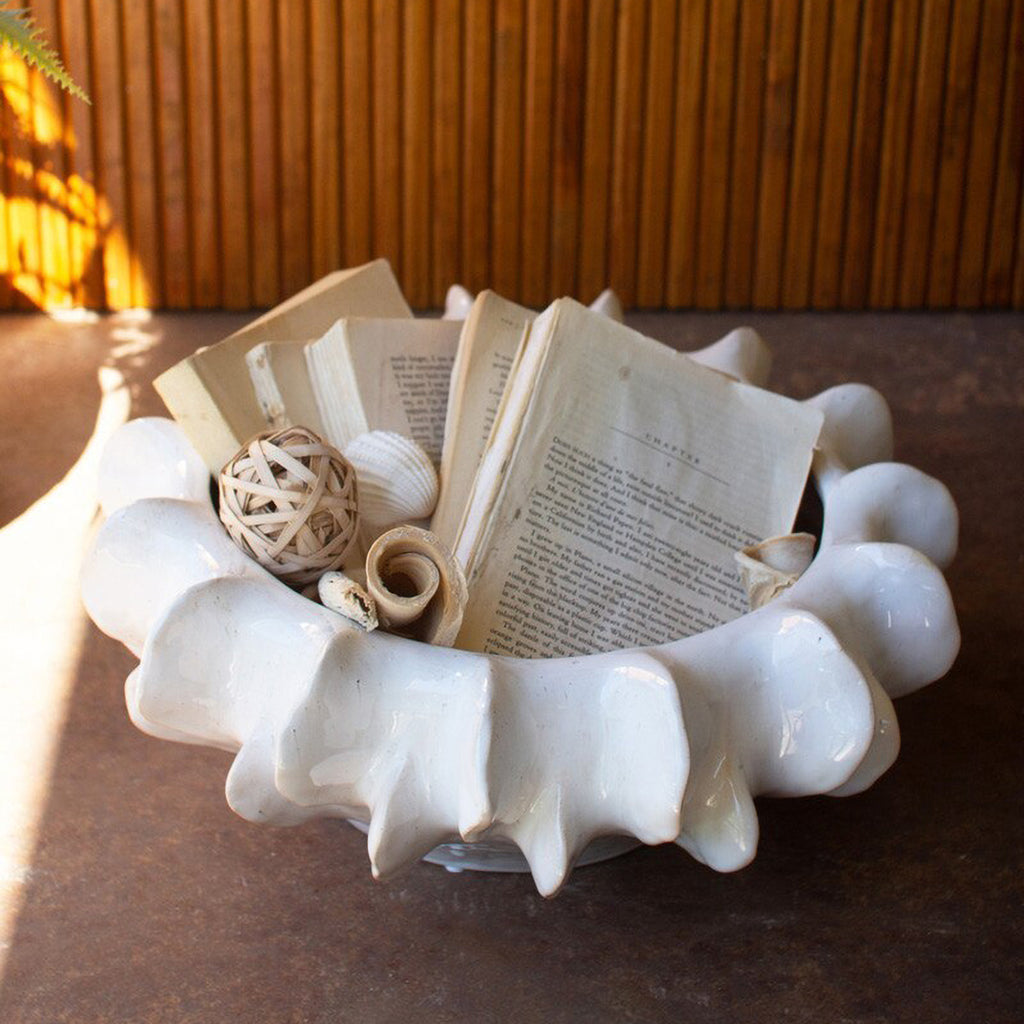 Splash of white? Try this glazed organic white ceramic compote. Display fruits or treasures in this unique piece that stands 6in tall and is 15.5in deep.