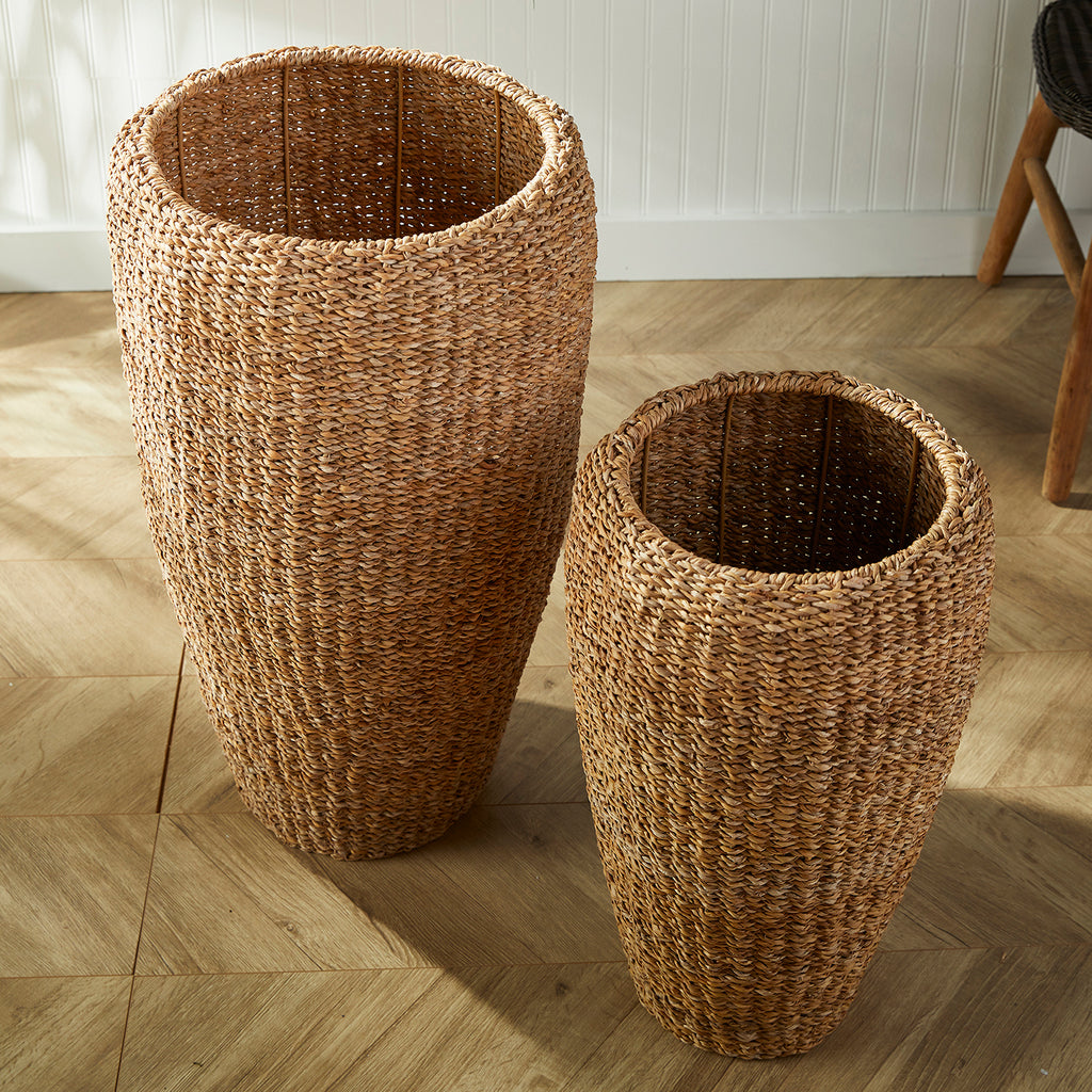 This set of tall seagrass planters are tightly woven around a wire metal frame. This warm, natural look in an over-scaled planter is a fresh look for your tall fau x greens.