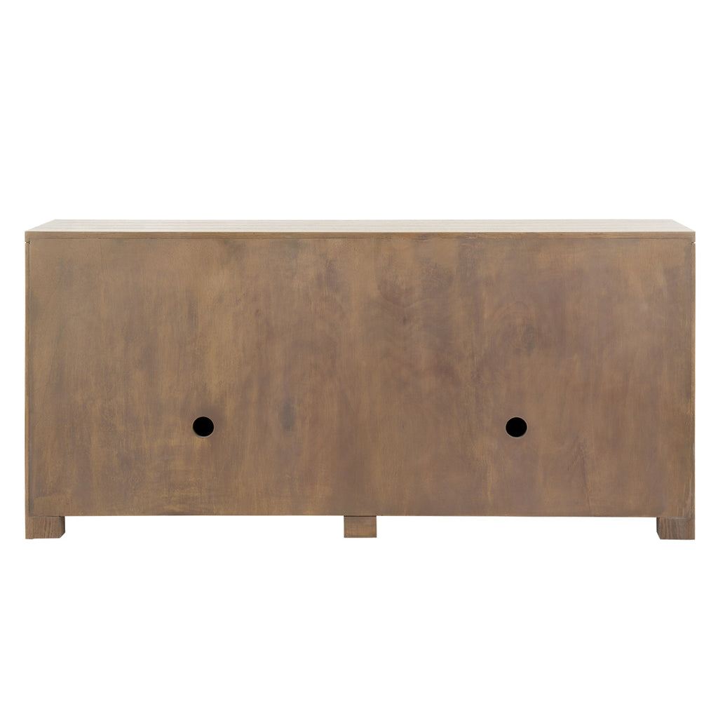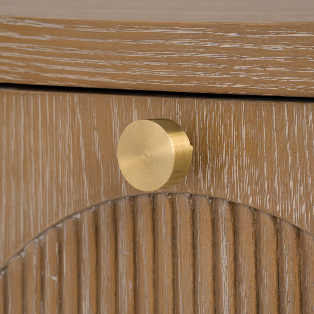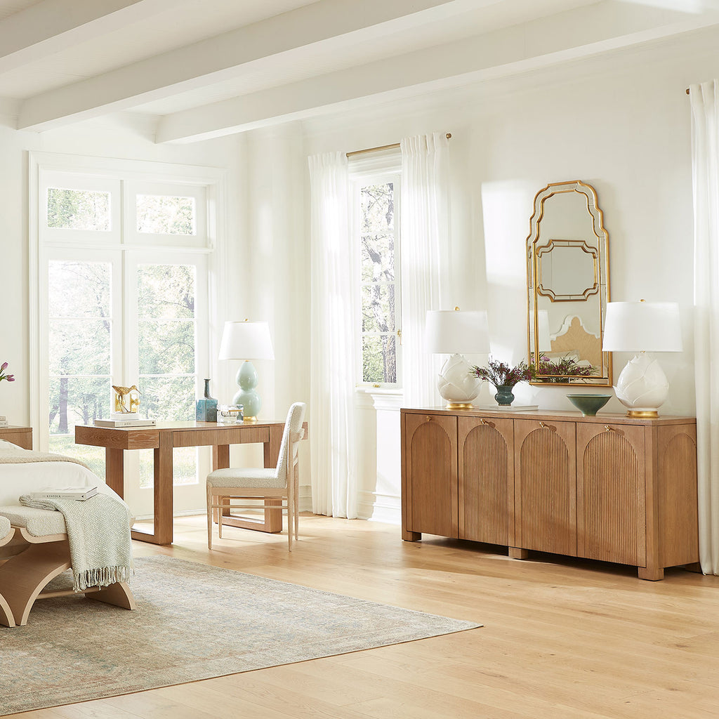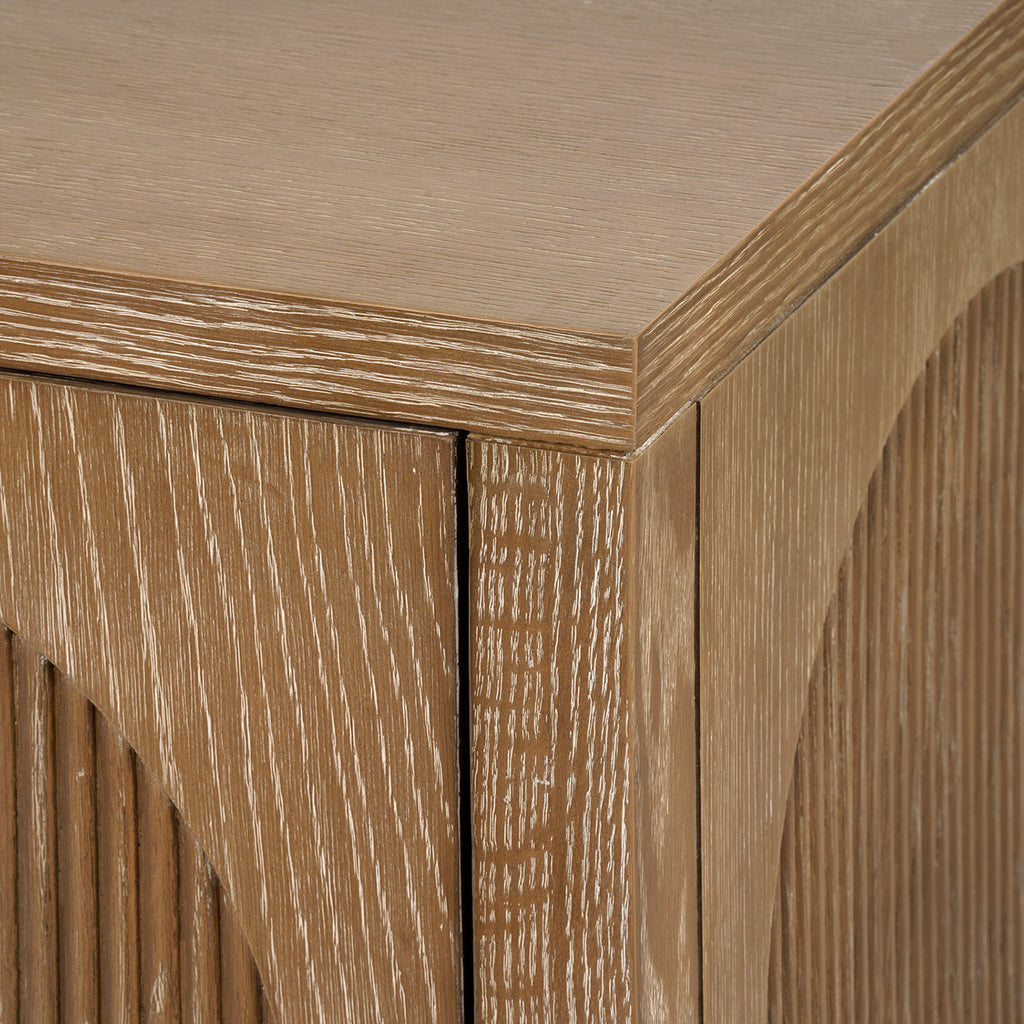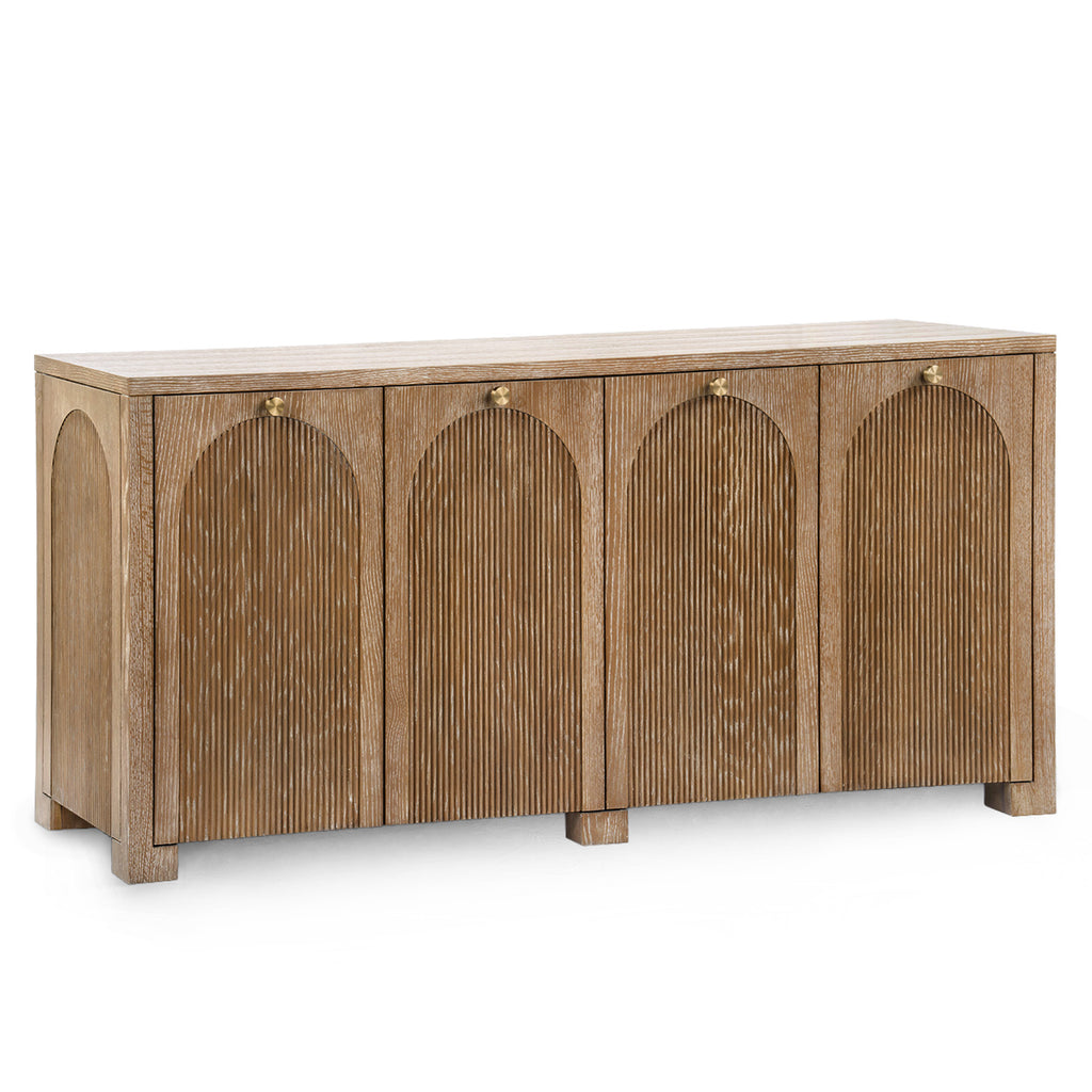 The V&H Arcadia 4-Door Cabinet is a refined storage piece that combines sculptural design with natural beauty. Its standout feature is the modern arched motif on each door, enhanced by subtle channeled detailing and topped with elegant Antique Brass pulls. Finished in Soft Glow Oak, the warm tone and visible wood grain bring a sense of organic richness to the design. Inside, adjustable shelving provides versatile storage, making the Arcadia as functional as it is visually striking—perfect for anchoring a dining room, entryway, or living space.