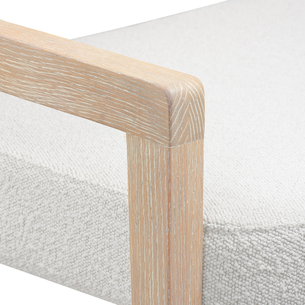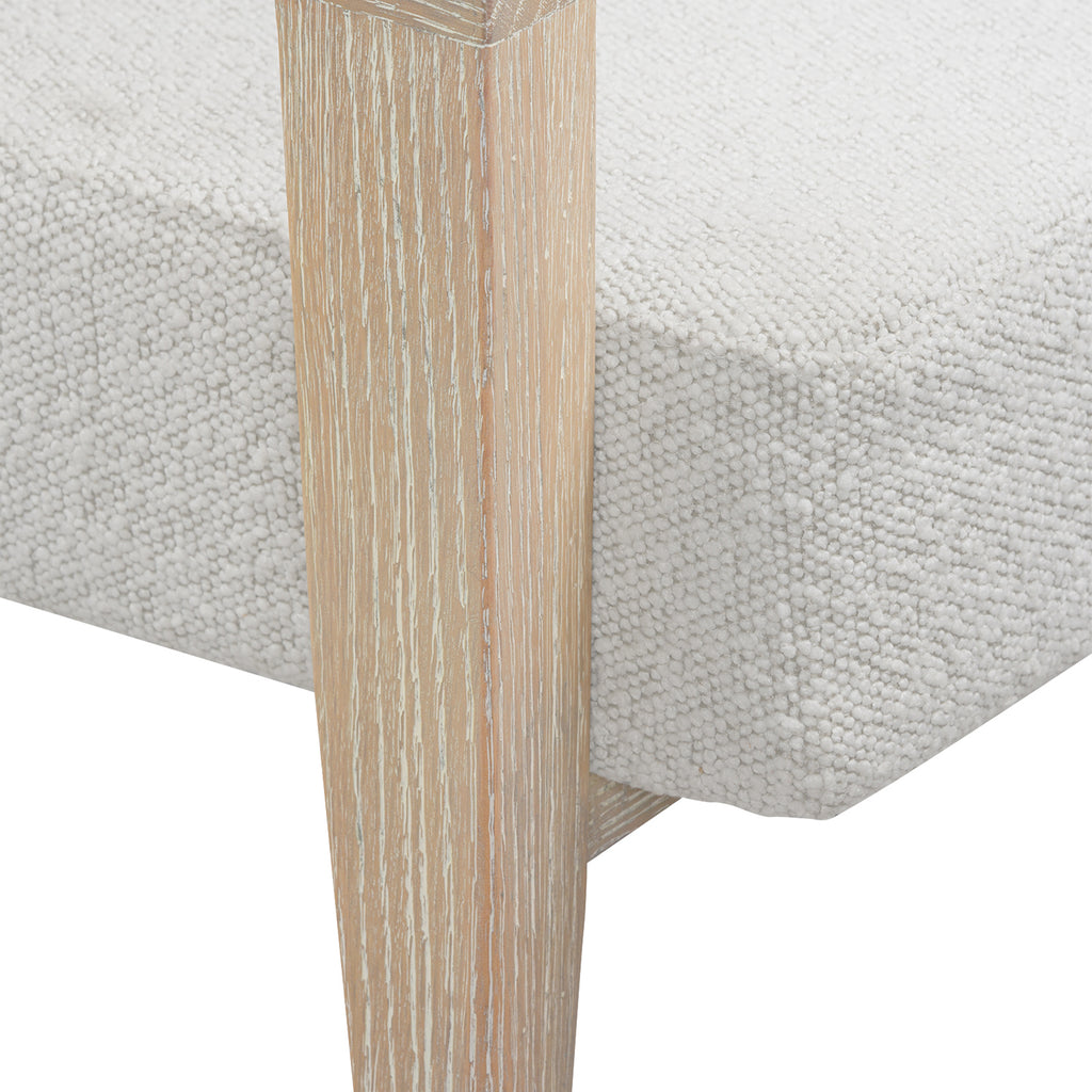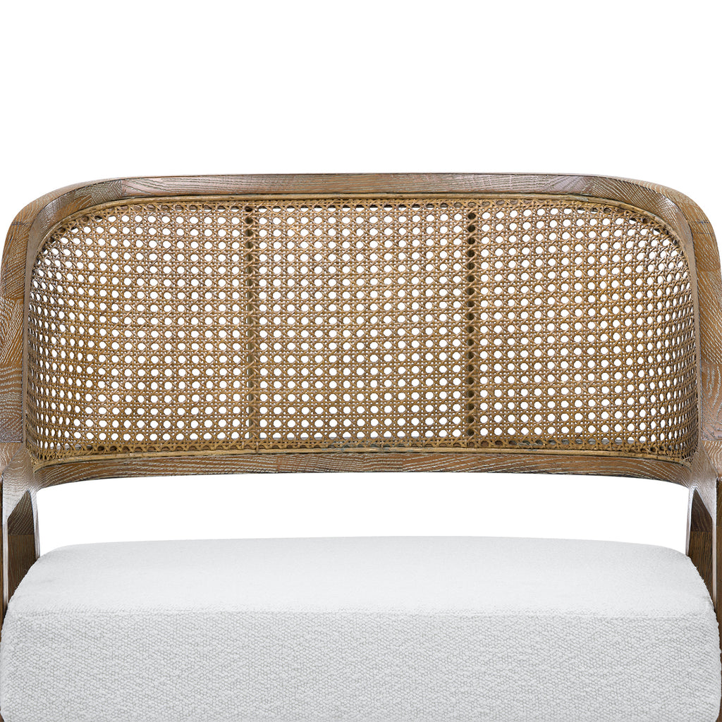 The V&H George Chair is a striking blend of comfort, texture, and thoughtful detail. Its generously wide seat is upholstered in plush white bouclé, offering an inviting place to lounge or entertain. The standout feature is the sculptural, curved backrest, which showcases a screen of lacquered, hand-tied caning—adding elegance, transparency, and artisanal quality. It's subtle and sophisticated with antique brass sabots capping each leg. Whether placed in a living room, study, or reading nook, the George Chair makes a refined and comfortable statement.