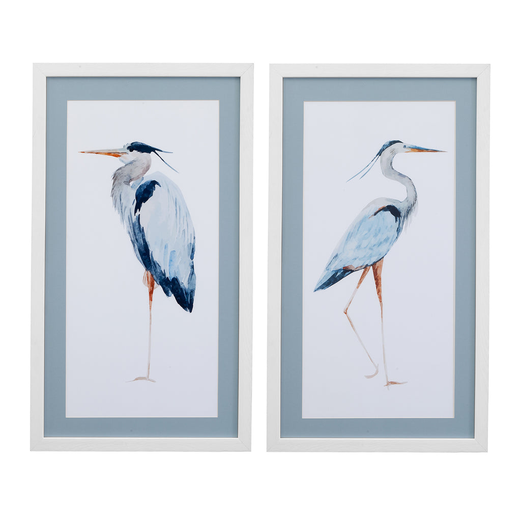 All framed under glass art is built to order in our warehouse in Bassett, VA. Please allow 4-6 weeks for shipping once your order is received. Heron is a 2 piece set that features a blue mat board and a 1.5in white wood molding. D-ring or sawtooth picture hanging hardware included. Material: Wood, Mat Board, Clear Glass. Made in the USA.
