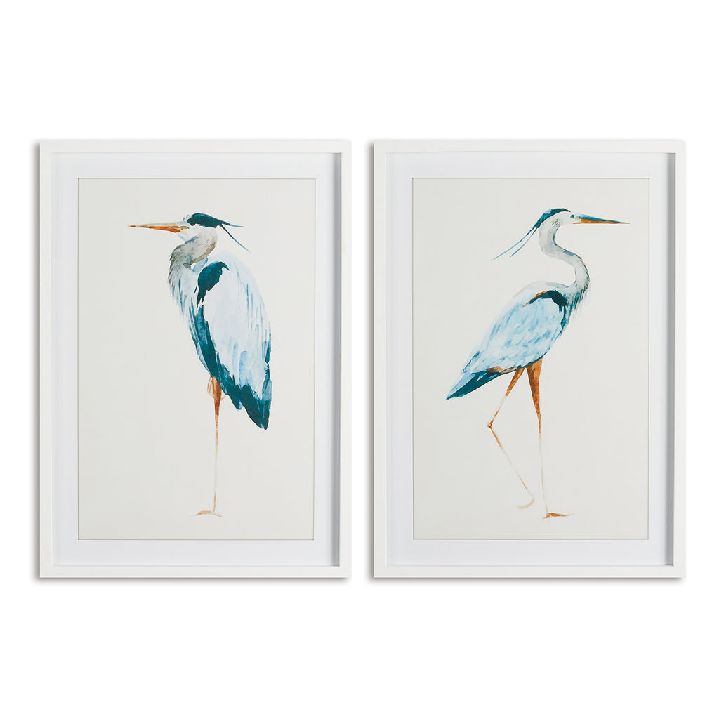 The Blue Heron is one of nature's most regal creatures. This pair is a charming interpretation. Finished off in simple white frames, this set makes a great addition to beach cottage or villa.