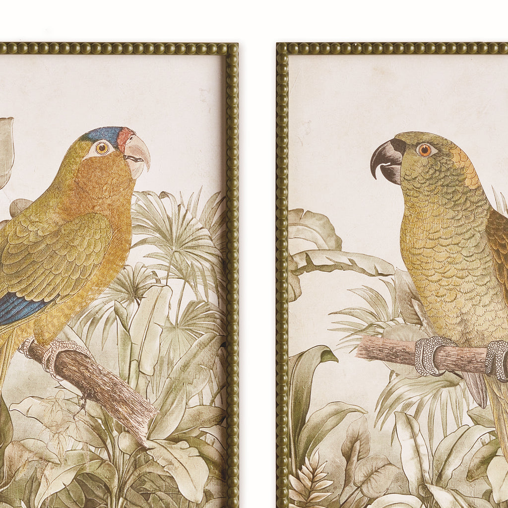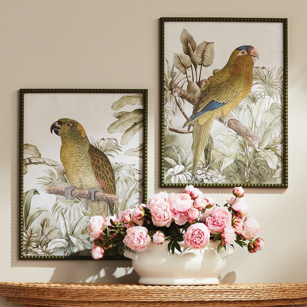 These tropical parrot prints with intricate backgrounds are a pop of color for any space from bedroom to foyer. In a classic British Colonial style, and finished off with a striking olive green frame, this set of two are made for the traditional beach cottage or any coastal-inspired setting.