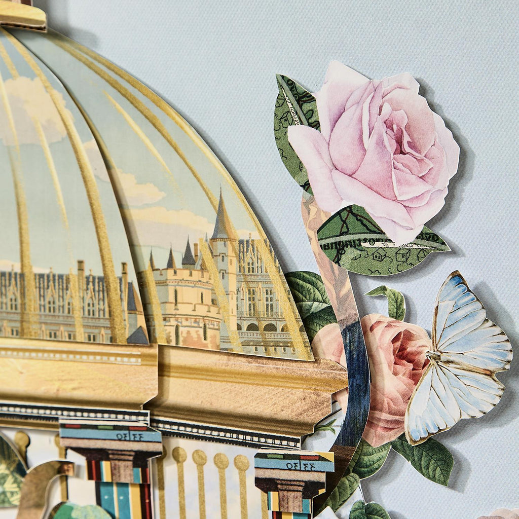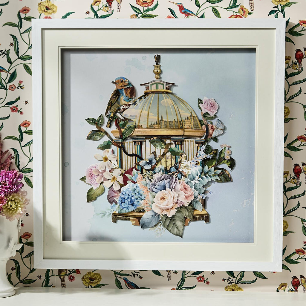 Transform any room into a tranquil garden oasis with our Bird Cage Paper Collage Wall Art. Handcrafted with delicate paper elements, this exquisite piece adds a touch of whimsical charm to your space. Measuring 27 1/2in square, it's the perfect focal point for a gallery wall or above a mantelpiece.