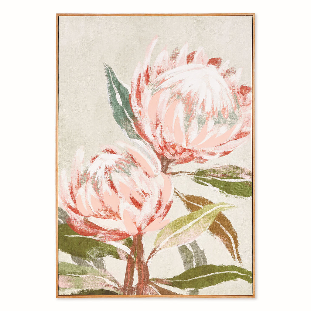 This nature-inspired wrapped canvas features a vibrant, multicolor composition of the king protea finished off with real walnut wood frames. A highly textured giclee on canvas that is embellished by hand, every brushstroke makes it utterly unique. A painterly work on canvas that makes a beautiful feature in living room, entry or foyer.