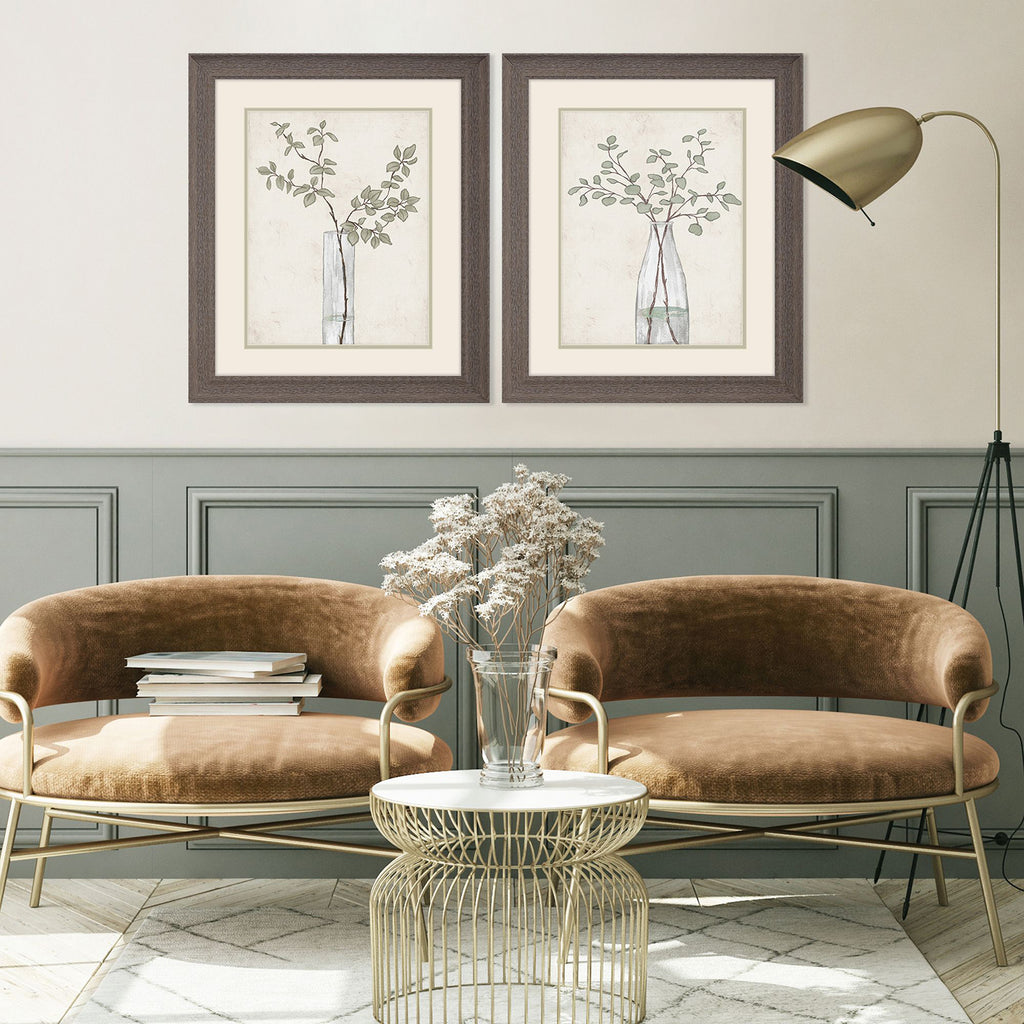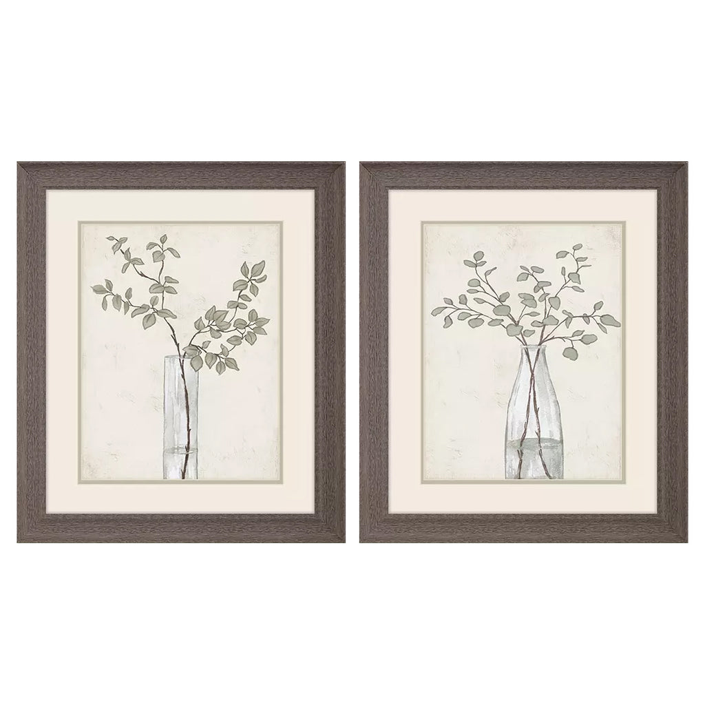 Delicate leaf stems are matted in white. Framed in a rustic wood-grain finish moulding.