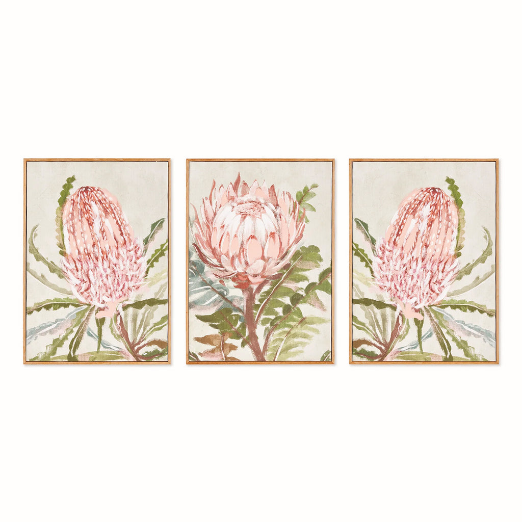 This nature-inspired triptych features vibrant, multicolor compositions of the queen protea plant finished off with walnut wood frames. A highly textured giclee on canvas that is embellished by hand, every brushstroke makes each piece utterly unique. A painterly trio that makes a beautiful feature in living room, entry or foyer.