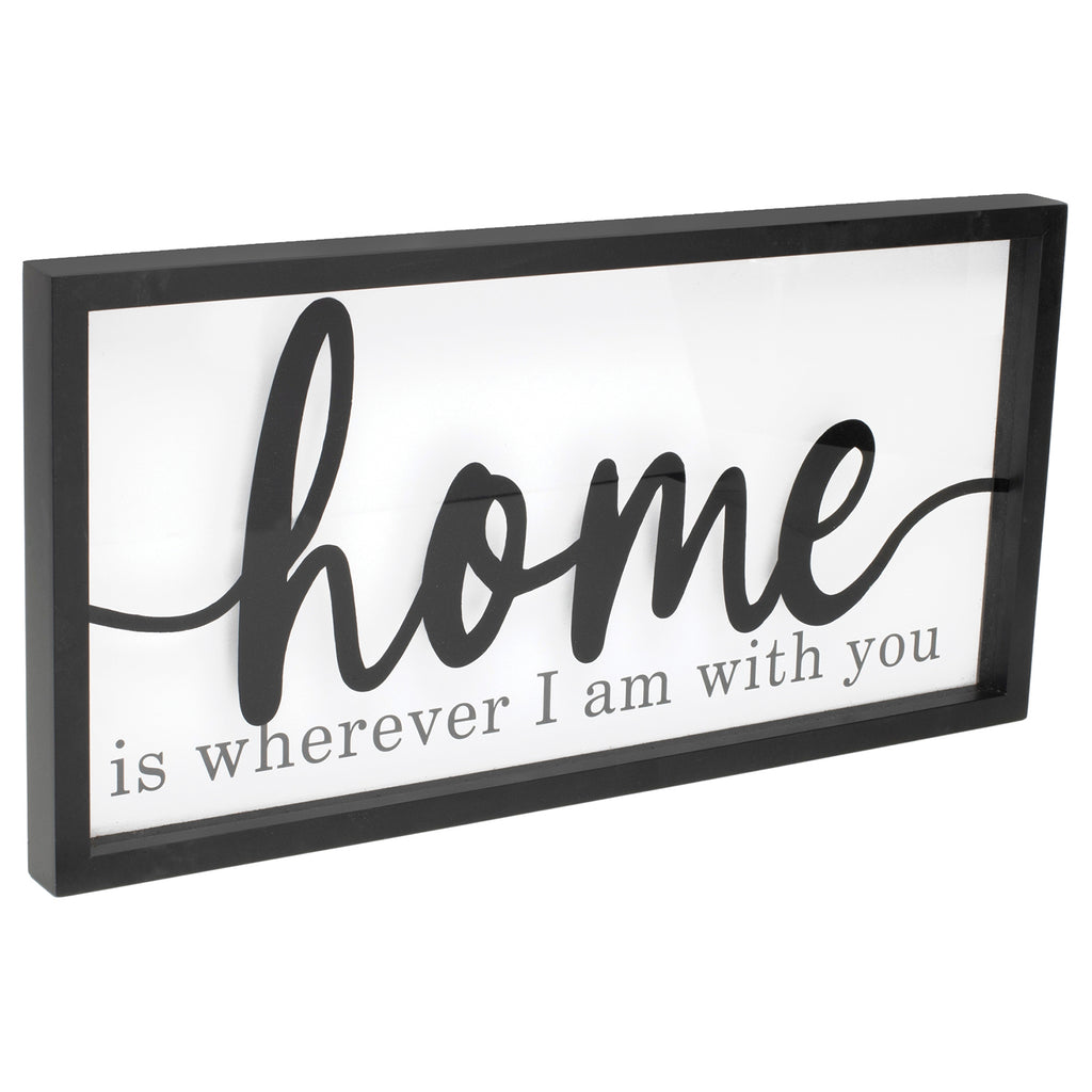 Welcome guests to your home with this stunning Home Sign. Feautring the sentiment, "Home is Wherever I am with You", the classic black and white tones paired with the elegant script and frame accent are perfect to create a memorable display. The quality wood and acrylic composition is sure to endure for seasons to come. Display the piece above your mantle or couch to share the message with guests or gift it to a friend to spread the love.