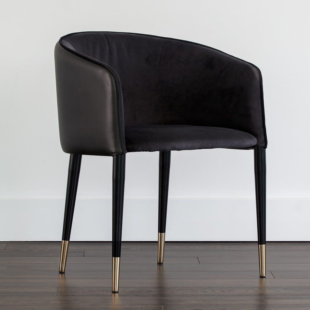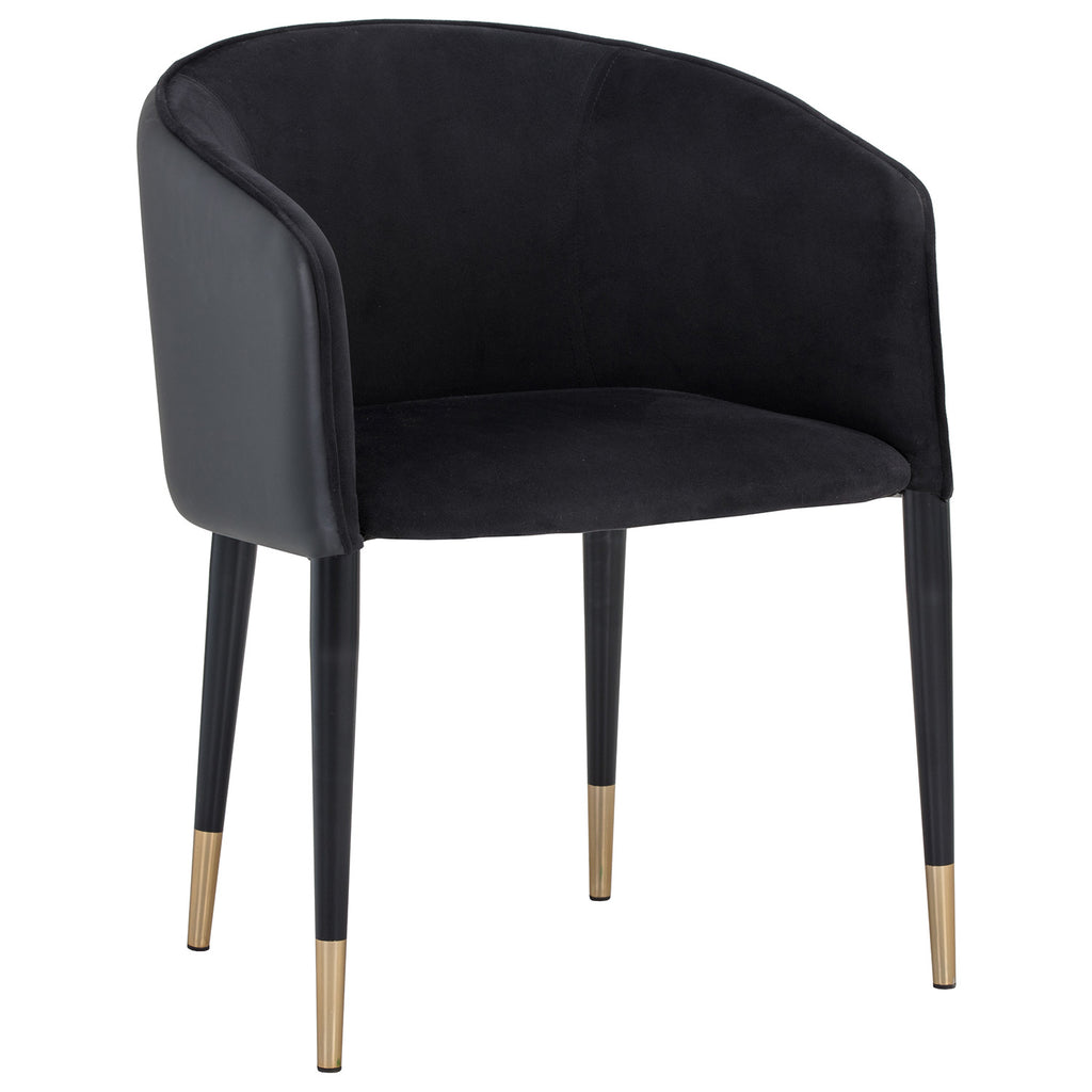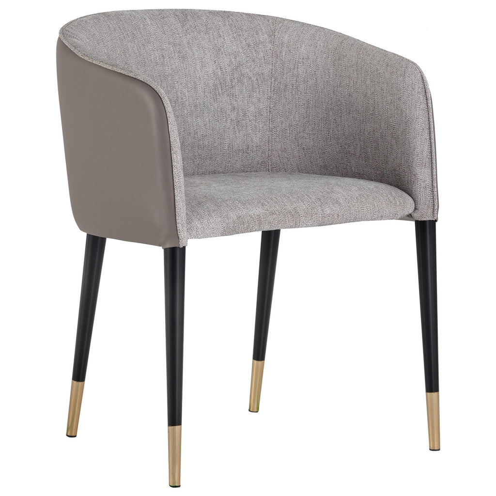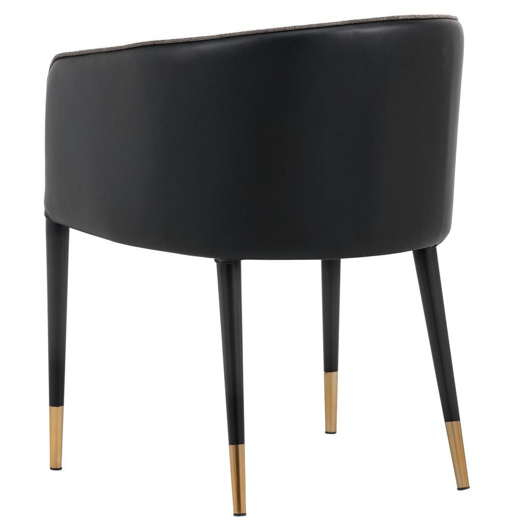 A modern barrel back dining armchair upholstered in fabric and contrasting faux leather. Finished with black steel legs and brushed gold foot caps.