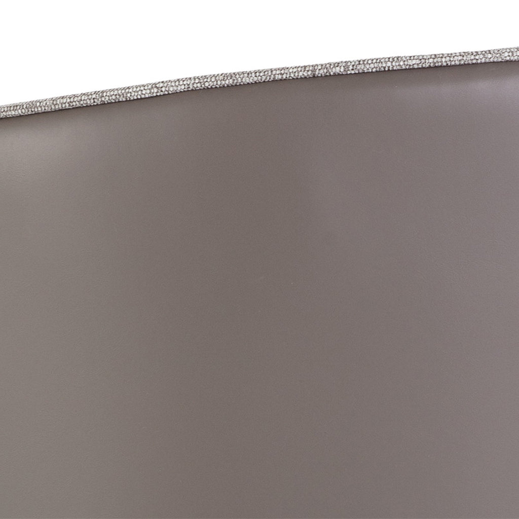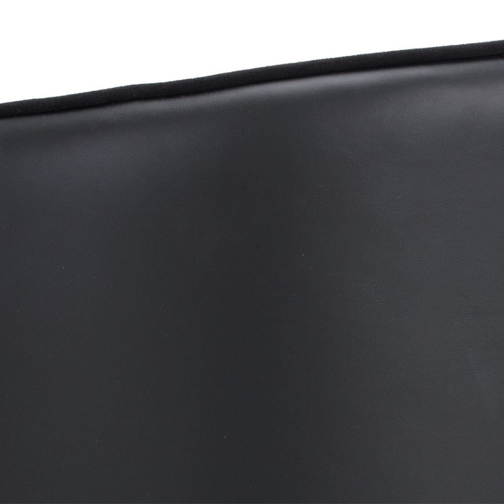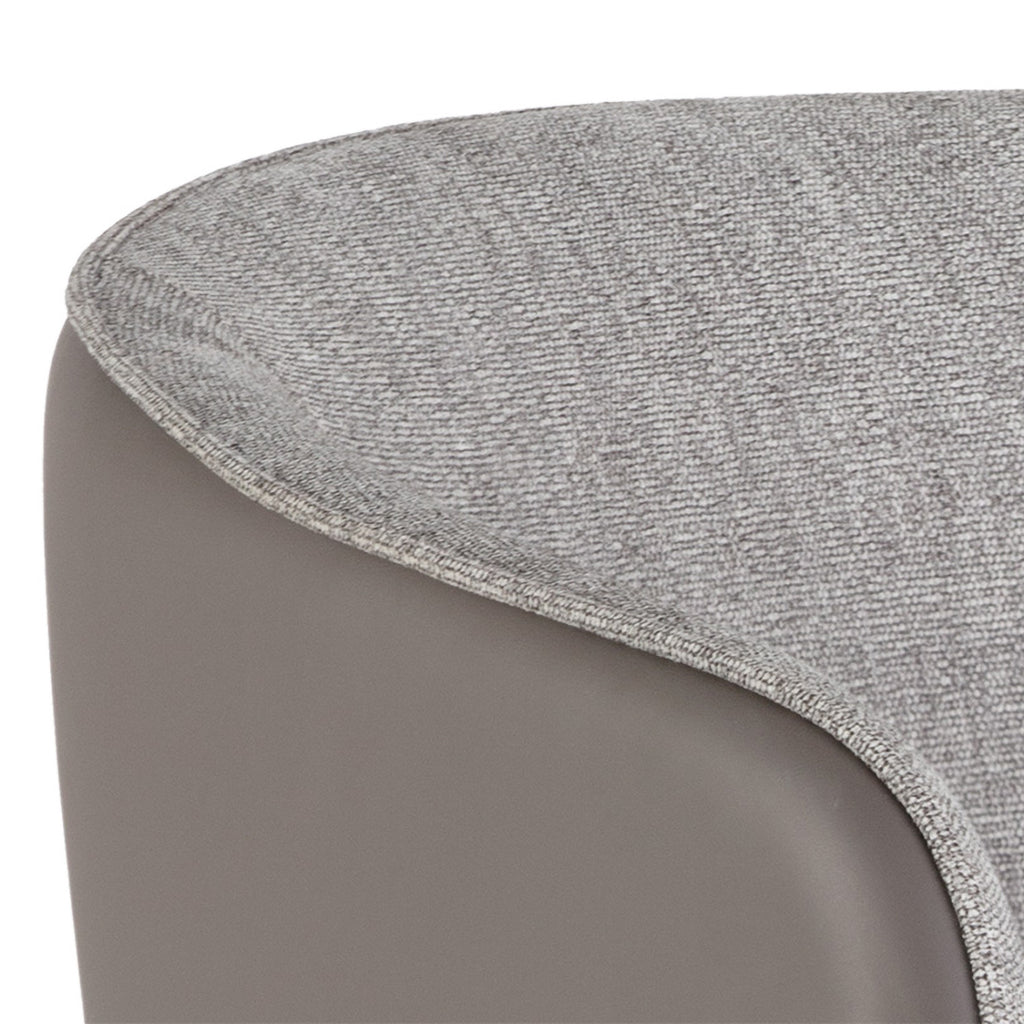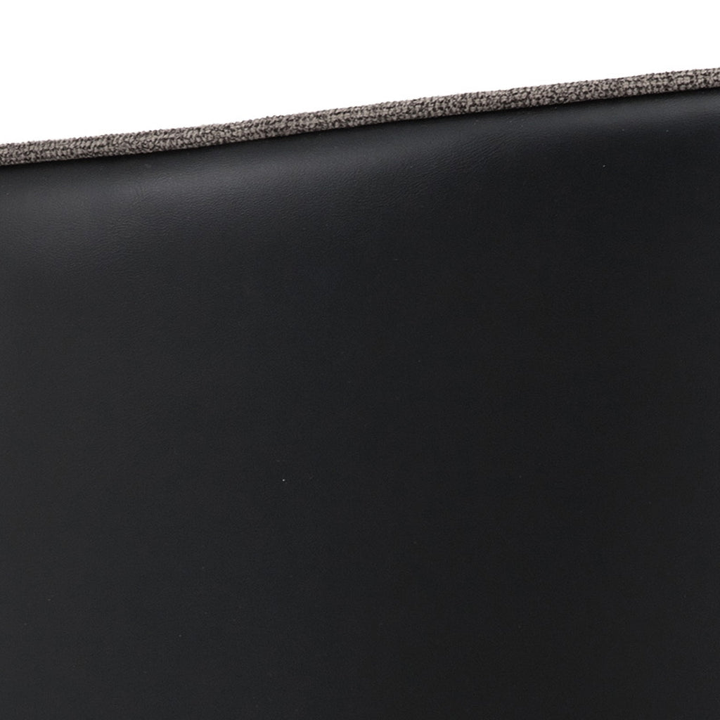 A modern barrel back dining armchair upholstered in fabric and contrasting faux leather. Finished with black steel legs and brushed gold foot caps.