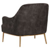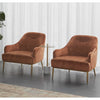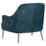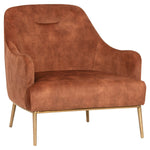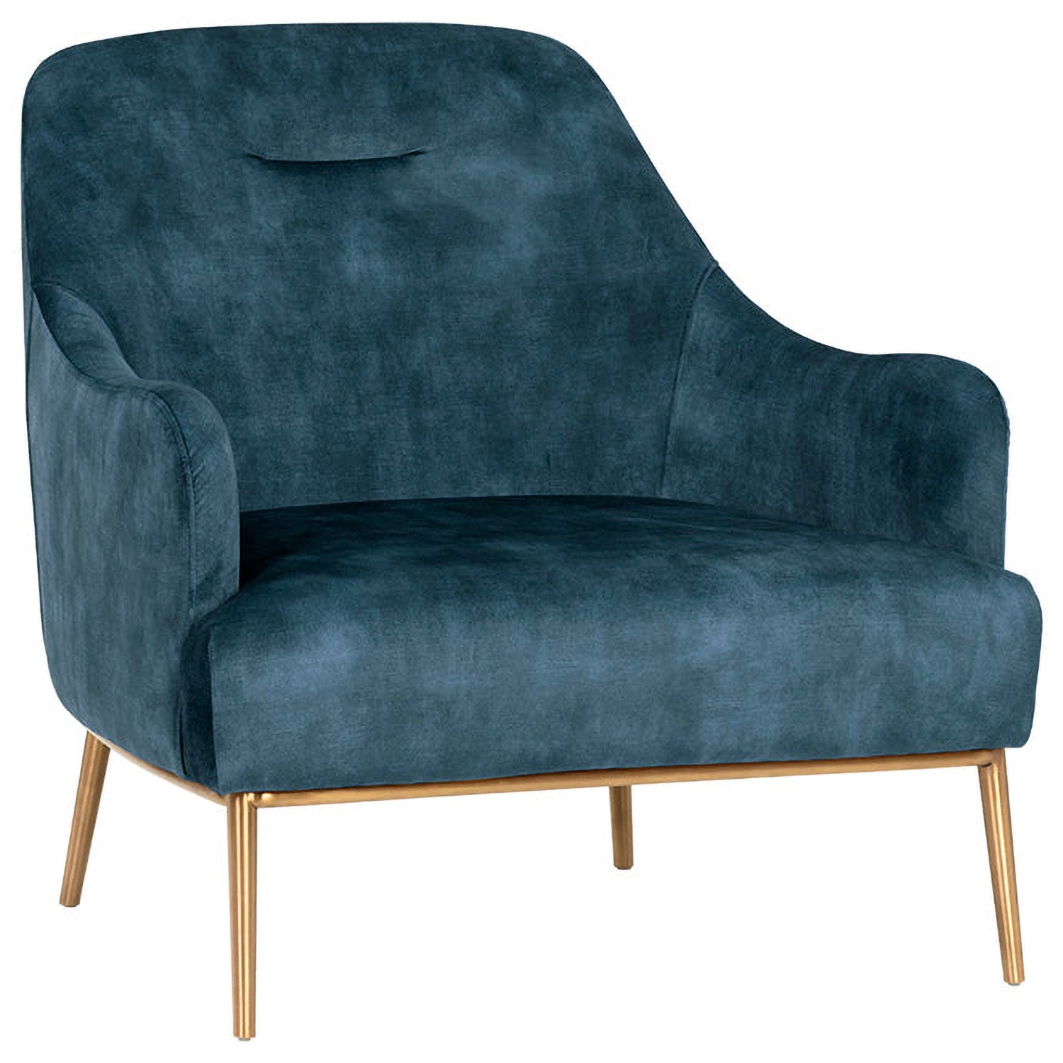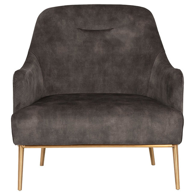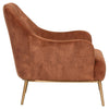 An elegant lounge chair with mid-century modern influence. Designed with a comfortable, single tufted seat and sloping arms. Stocked in a beautiful, velvet-like nono petrol, rust or shitake fabric. Nono fabric features a natural variation of light and dark sections. An exposed gold stainless steel frame and legs complete the look.