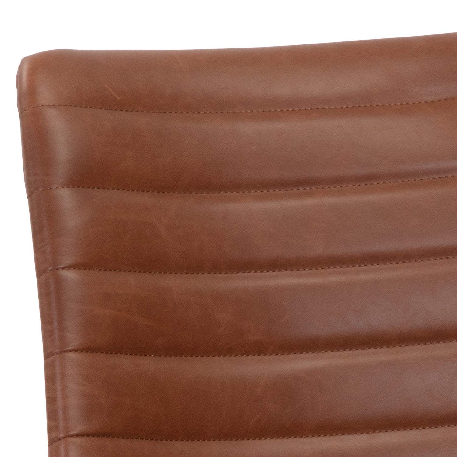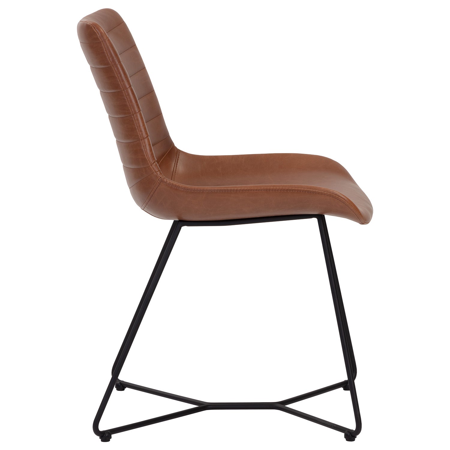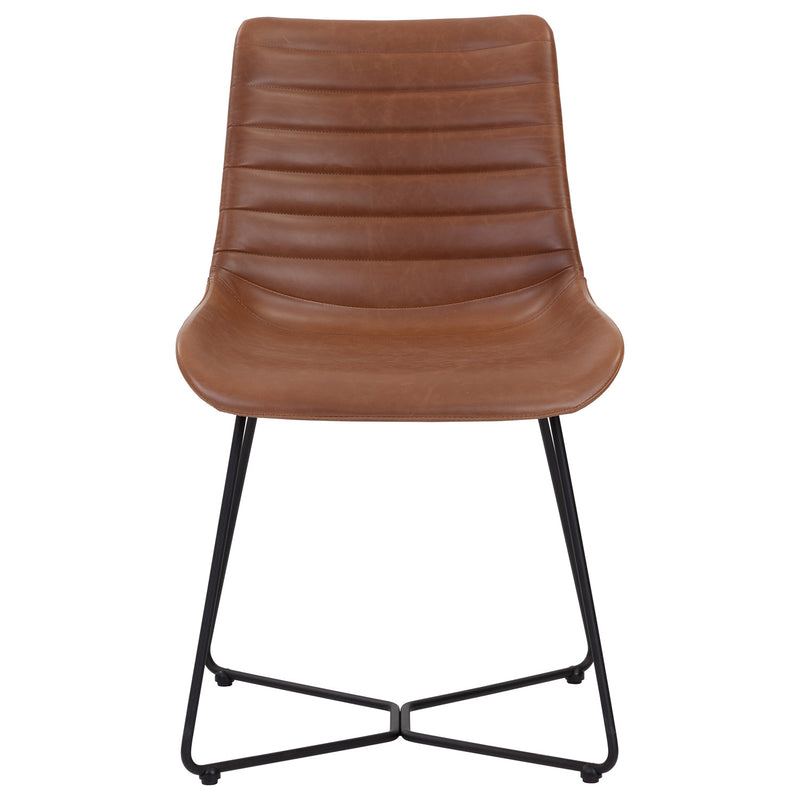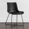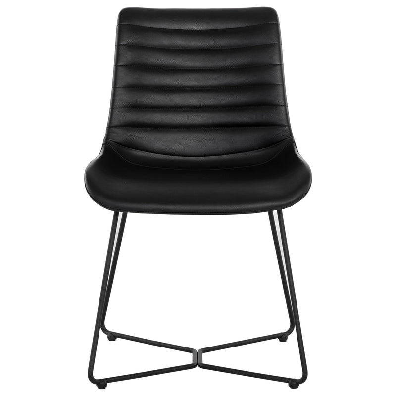 With an understated design, this minimalist dining chair demonstrates the beauty of simplicity. Stocked in dawn gray, hazelnut and nightfall black faux leathers or ivory fabric, and completed with powder coated metal legs in a matte black finish.