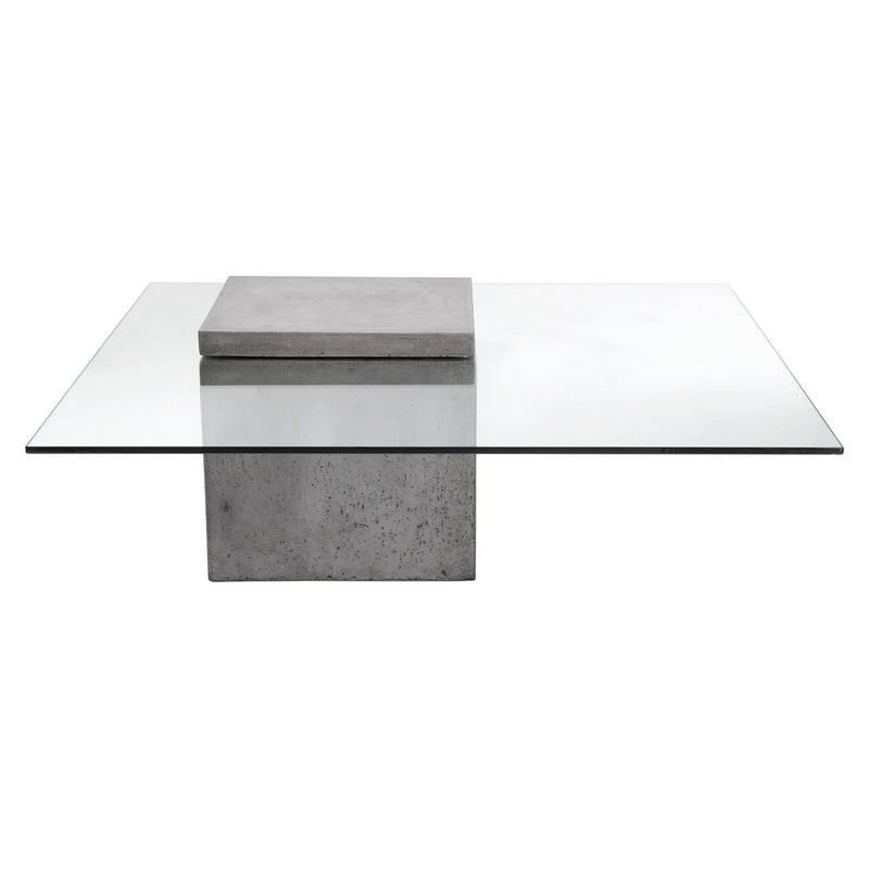 A bold concrete block defines this industrial modern coffee table. Features a contrasting 10mm tempered glass top embedded within the top of the base. A perfect complement to the design. Crafted from a natural concrete mix, each piece will look different