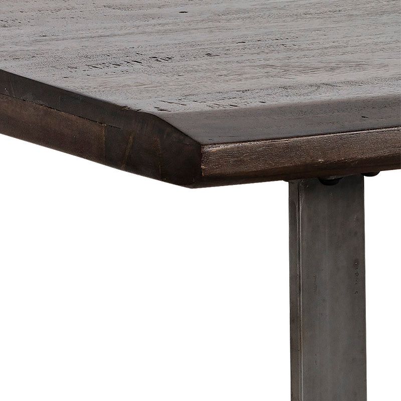 Crafted in India, this rectangular coffee table combines rustic and industrial elements perfect for transitional spaces. Featuring a solid acacia wood top in a rich walnut brown finish, with a contrasting antique gunmetal steel base.
