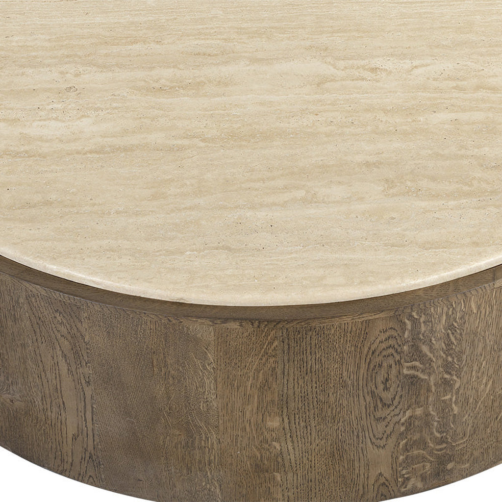 The simple round silhouette of the Oberon Coffee Table accentuates the inherent beauty of natural mixed materials for a versatile piece that will enhance any room. Handcrafted and finished by skilled artisans, this piece includes a solid travertine top and an oak veneer base with a solid oak wood edge. As travertine is a natural material, unique veining, pitting, fissures, micro-cracks and color variations are all characteristics that add to the uniqueness and beauty of each piece. As wood is an organic, porous material, these pieces will contain natural variation of texture and may also exhibit fine indentations and cracks. Wood pieces will also display a disparity of color and grain, and visible knots and burls that add to the character of each piece. Made in India. With refined craftsmanship, this design was brought to life by skilled local artisans. Due to the nature of handcraftsmanship, unique imperfections such as fissures, markings and variations in color and shape are welcomed and appreciated characteristics for a truly one-of-a-kind piece.