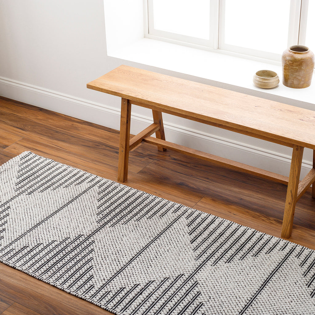 The simplistic yet compelling rugs from the Daffodil Pyramids Hand Woven Rug effortlessly serve as the exemplar representation of modern decor. The meticulously woven construction of these pieces boasts durability and will provide natural charm into your decor space. Made with Recycled PET Yarn in India, and has Low Pile. Spot Clean Only.