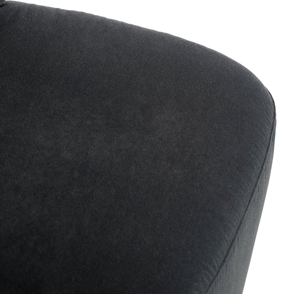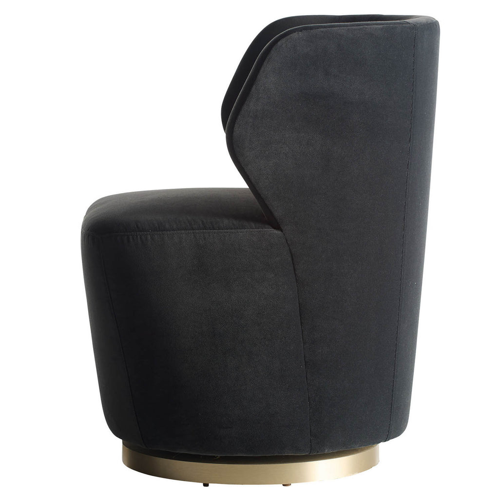 A dramatic take on the Poppy chair in midnight grey performance velvet, perched on a champagne iron swivel base—sophisticated, compact, and adaptable. Finish will vary.