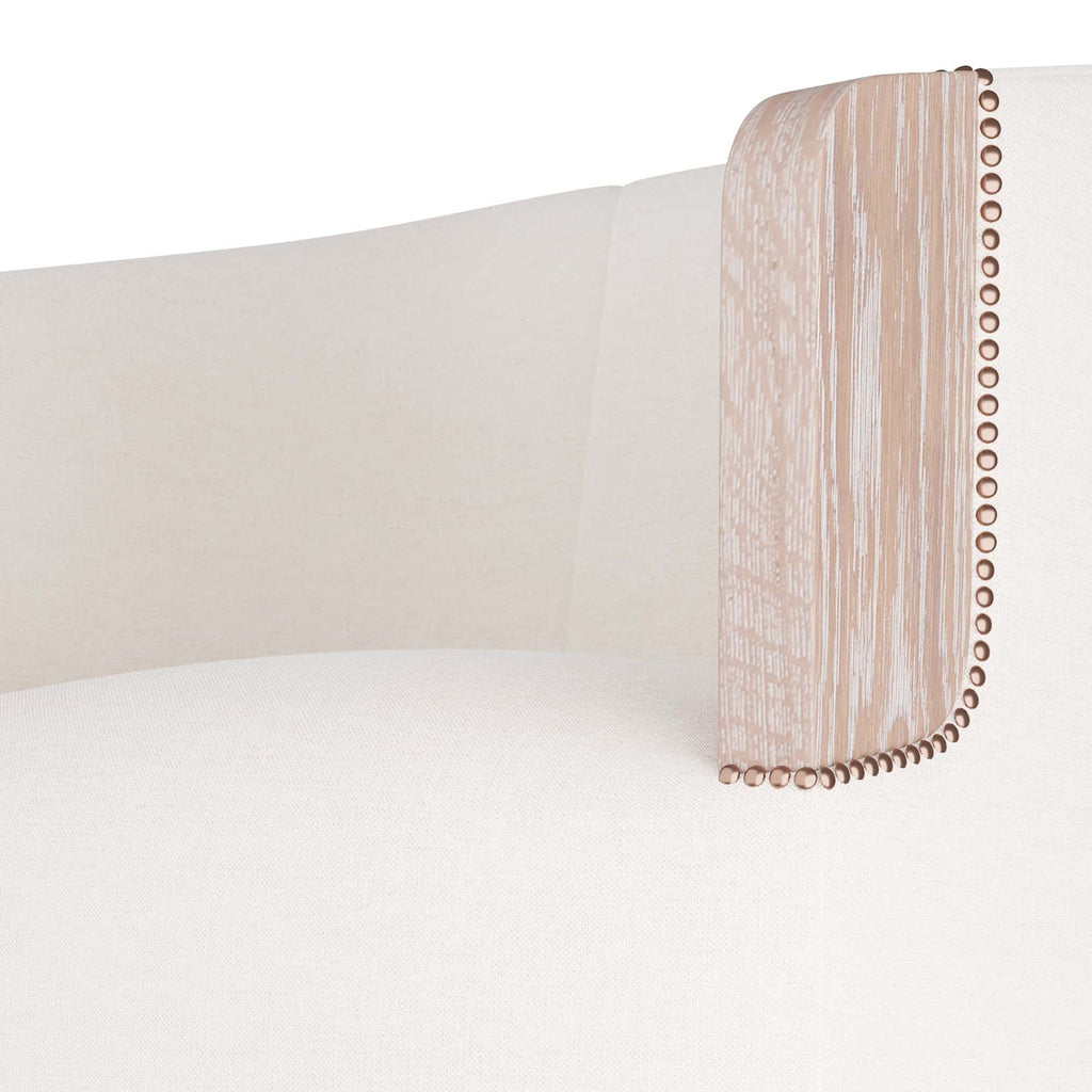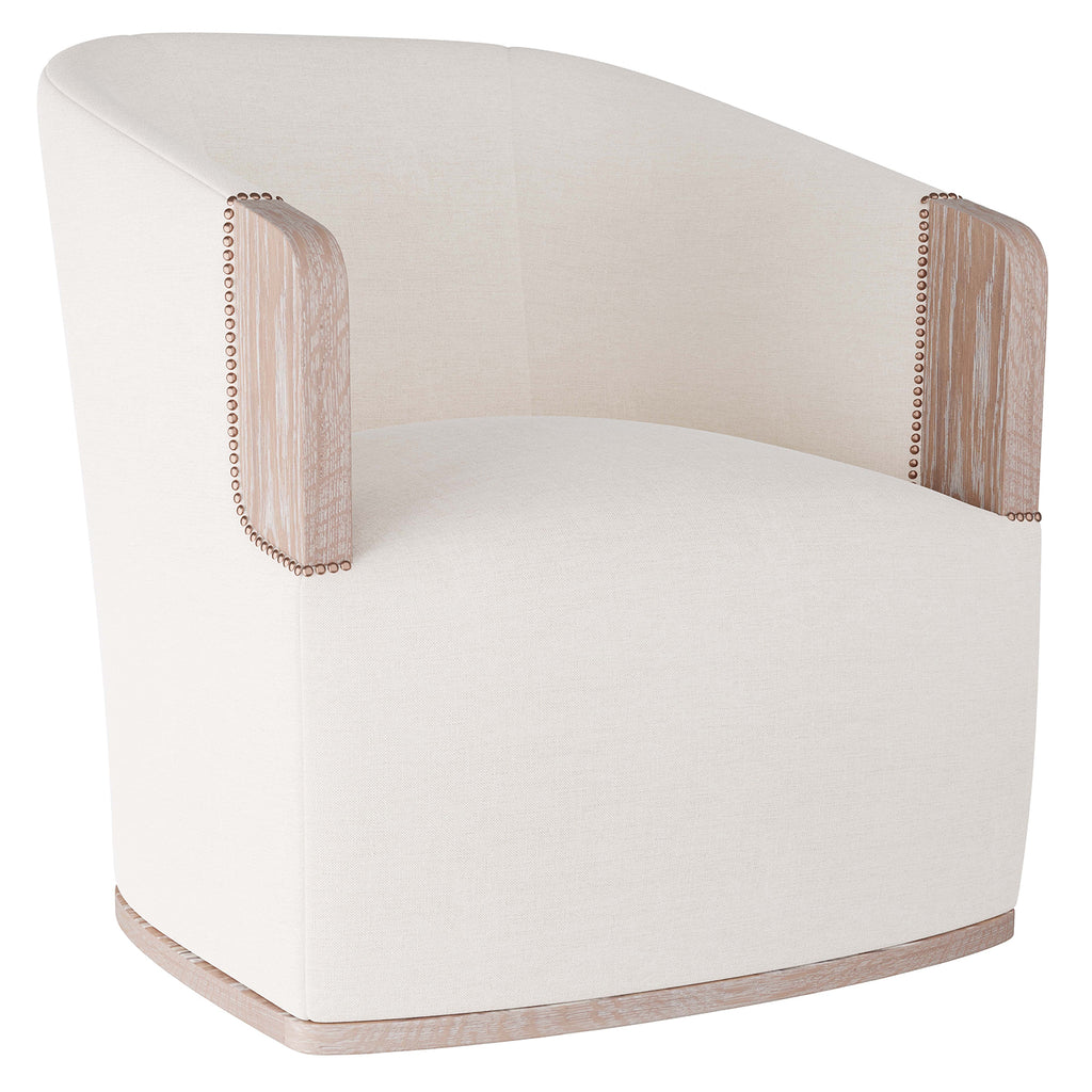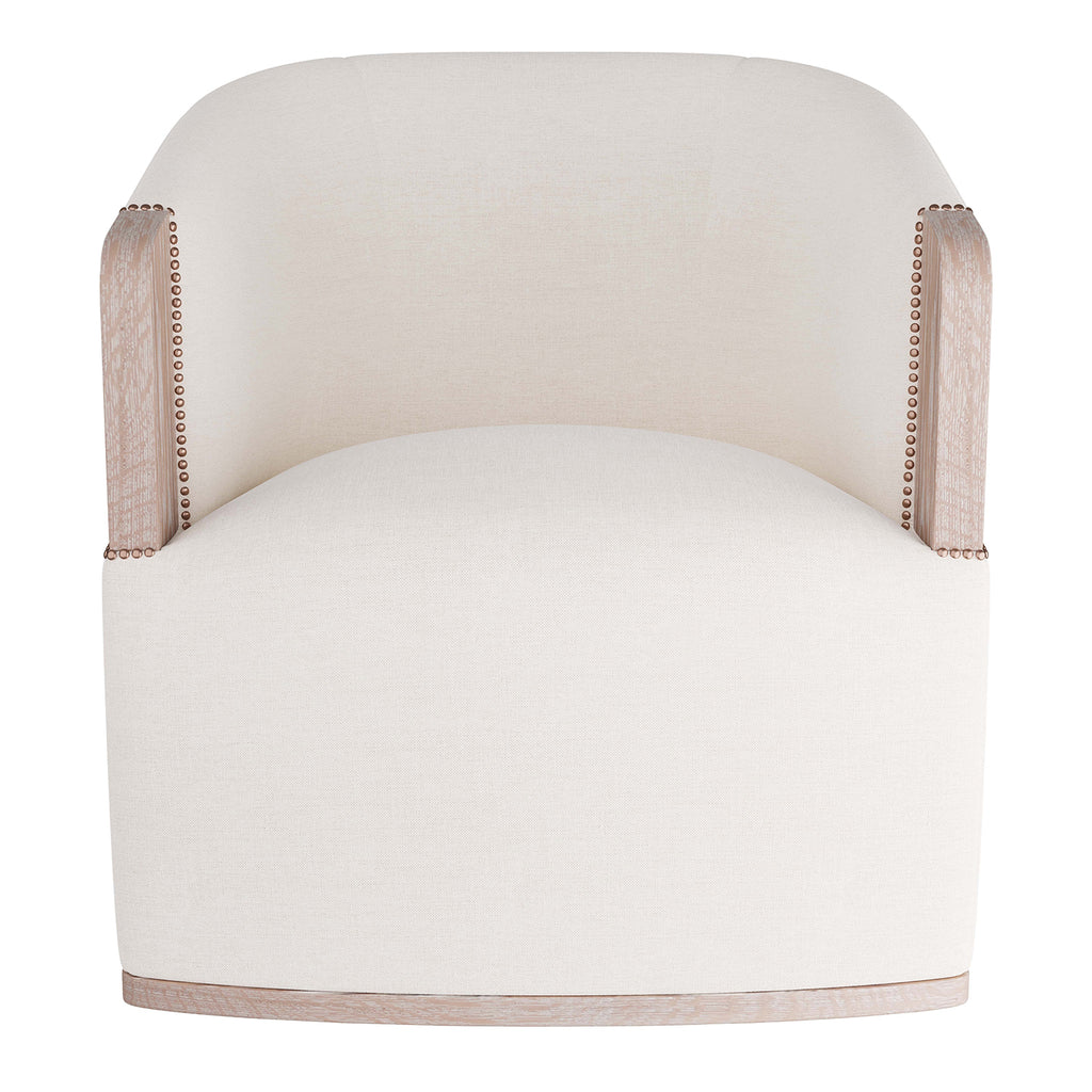 We love the exposed cerused oak at the end of this chic swivel chair's arm, the first area to show wear on the upholstered bone linen chair. Clean lined comfort with added antique brass nail head details work in any room in the house.