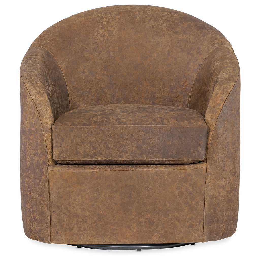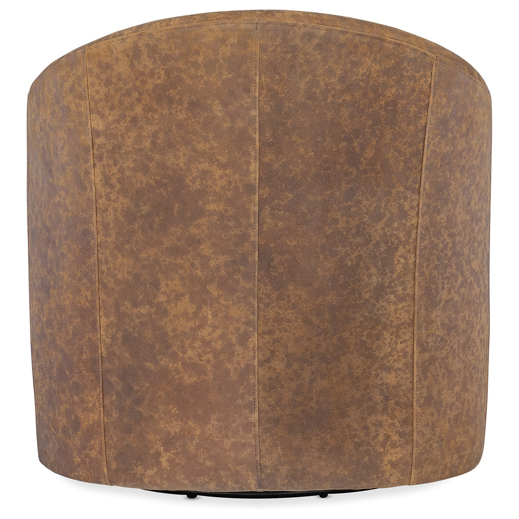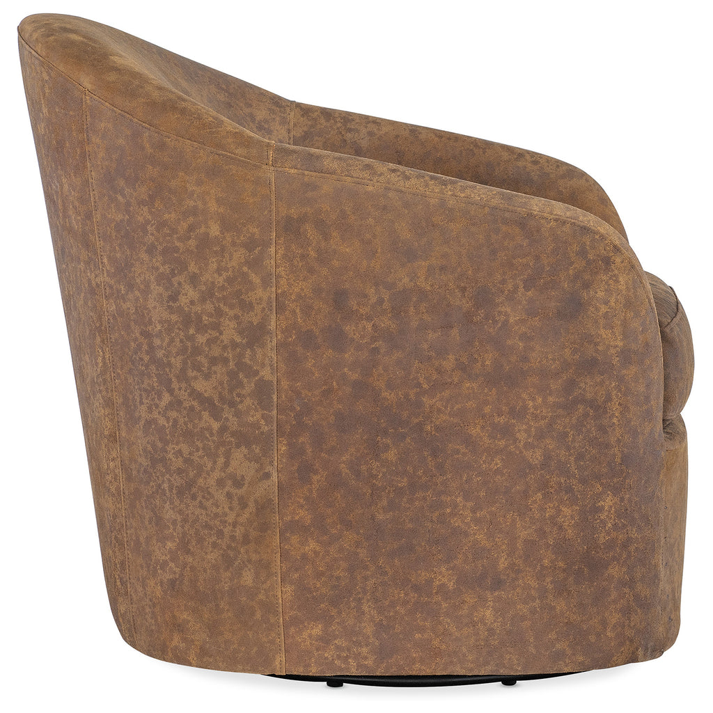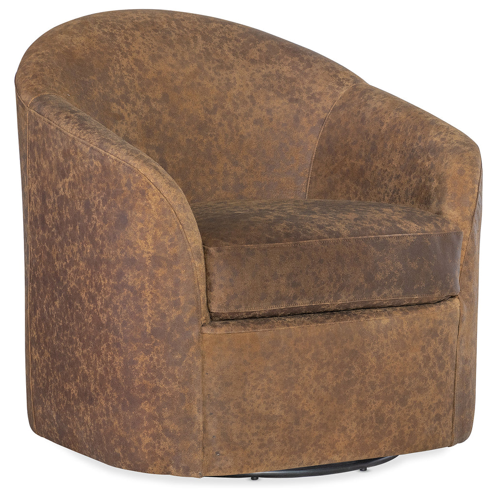 Softly organic, the Remi Swivel Chair has a barrel back, sloped arms and loose seat cushion, covered in a subtly distressed brown leather.