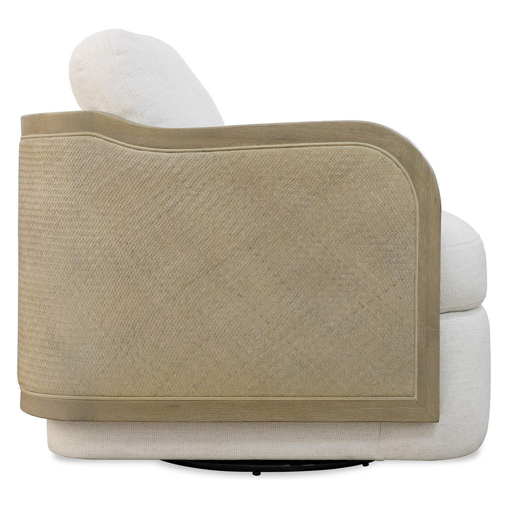 The Wilma Swivel Chair brings breezy sophistication to any relaxed setting. Framed in light wood with a woven rattan exterior, this chair features a smooth swivel base and is upholstered in soft, durable Halston White performance fabric. Its sculpted profile and natural textures make it a perfect fit for coastal, casual, or transitional spaces. Hooker Furniture Upholstery is a designer-inspired collection of upscale leather seating that includes versatile reclining chairs, modern-day reclining sofas, eclectic club and artisan accent chairs, as well as a selection of executive desk chairs for the home. Designed and curated to appeal to a variety of style tastes, each piece from Hooker Furniture Upholstery is meticulously crafted in a unique selection of textures and hues.