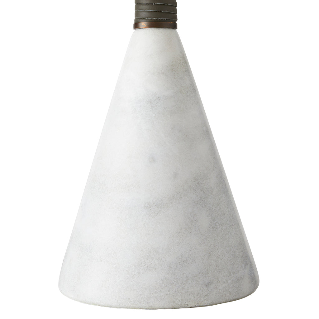 The simple form of the Arteriors Everly Table Lamp brings the allure of its materials into sharper focus. A conical white marble base is wrapped at the top in graphite leather, then adorned with a traditional drum shade of ivory microfiber. Heritage brass hardware and finial, and taupe cloth cord. Finish will vary.