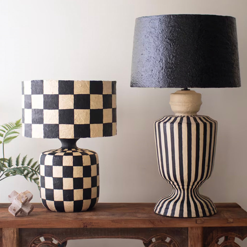 Game room decor anyone? This black and white paper mache lamp has a checkerboard pattern on its base and shade. It also works as a racing room addition.