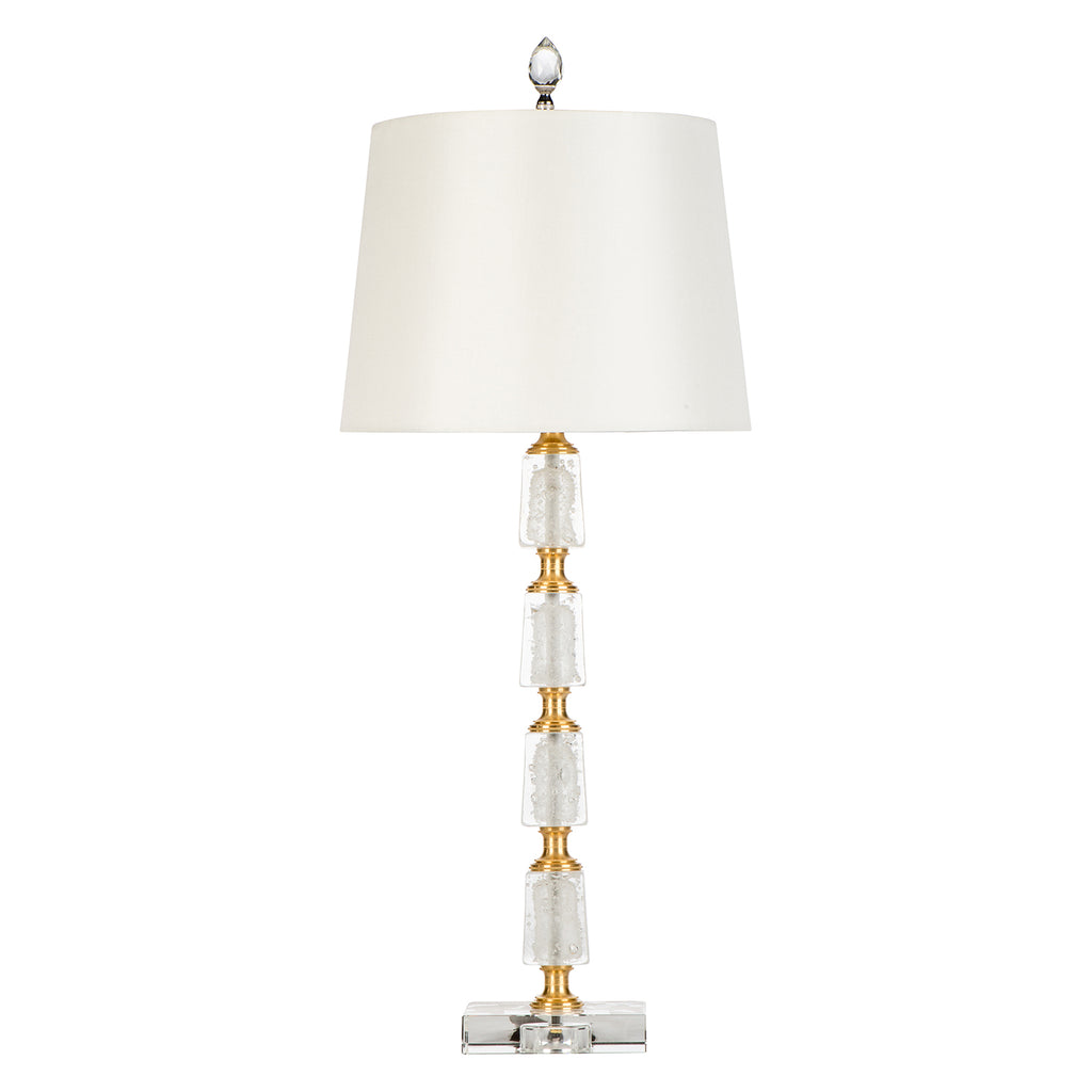 27" four tiered stacked artistic glass cube lamp featuring faux rock crystal cubes separated by Italian brass pedestals. All mounted on a square glass base along with a crystal finial and off-white drum shade.