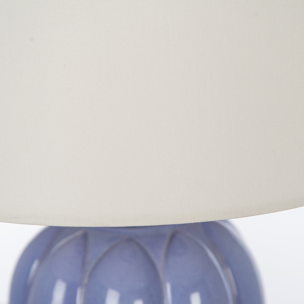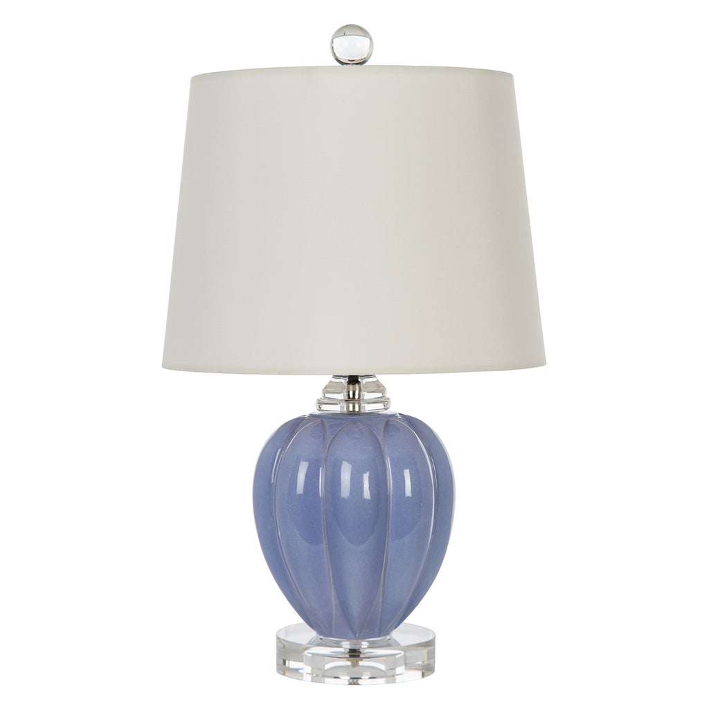 Tapering scallops create a petite base for this curvy ceramic table lamp. Adding soft color to a nightstand or end table, the lamp features crystal accents that bring a sense of light and airy style. A cream shade delivers lovely, diffused lighting in any room.