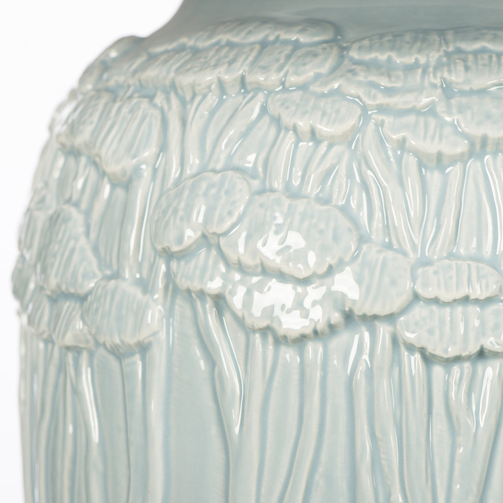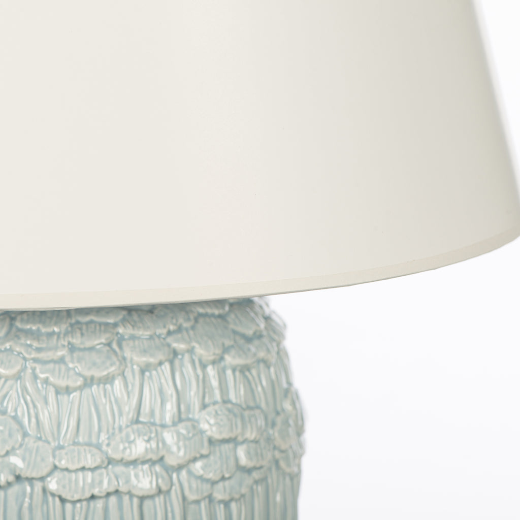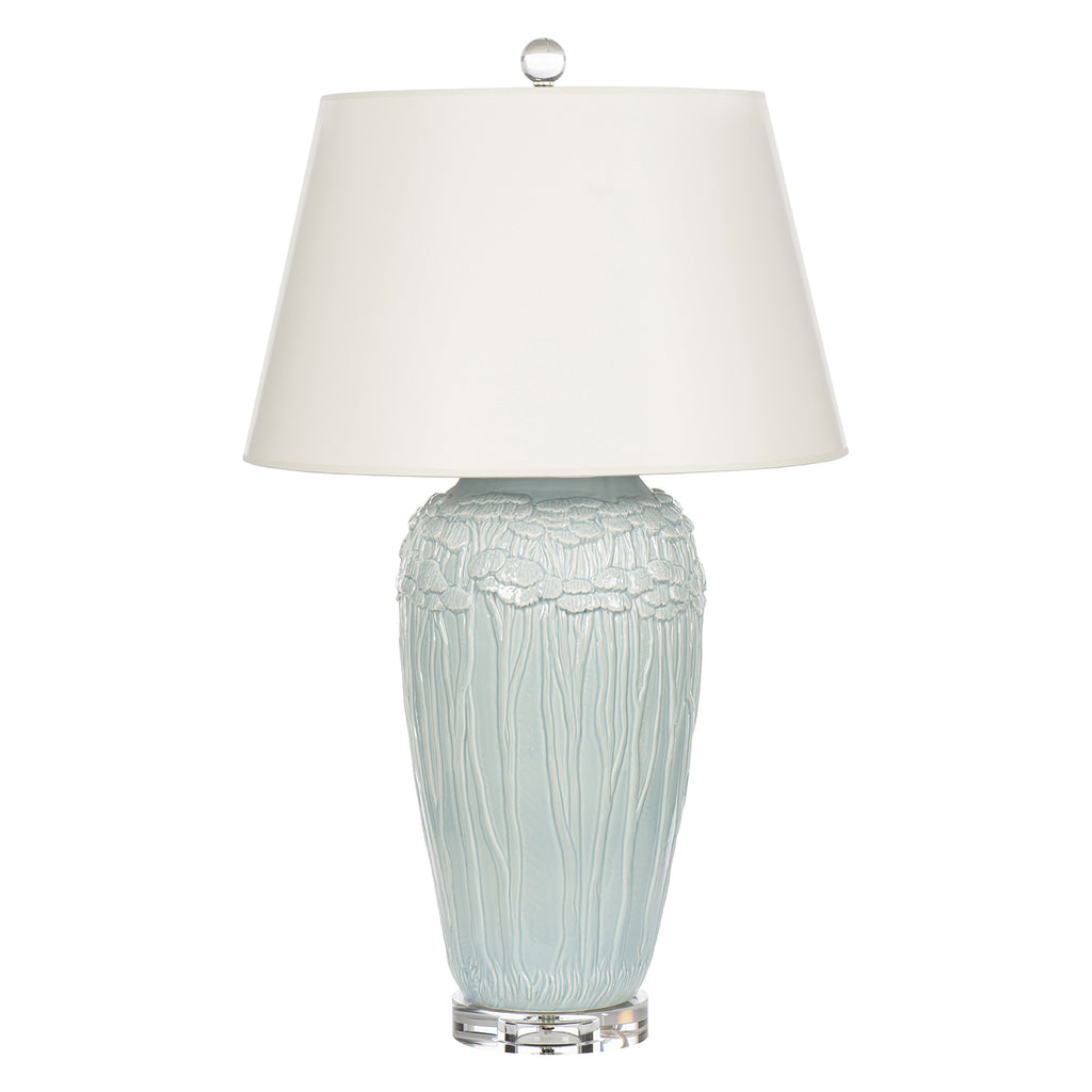 Floral embossing brings wonderful texture and subtle style to this ceramic table lamp. Beautiful in soft, light blue, the lamp features crystal accents that enhance a sophisticated, elegant aesthetic. An empire shade in white parchment creates wonderful illumination in a living room or library.