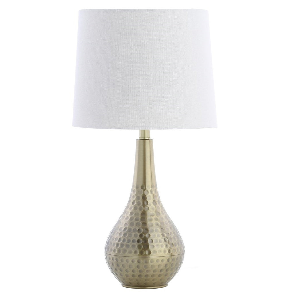 A luxurious addition to any living room, this contemporary table lamp is a classic. Crafted with a radiant plated Gold finish and a tapered White shade, its texture adds character and charm to the gentle curves of its genie-style body.