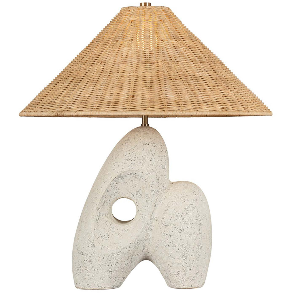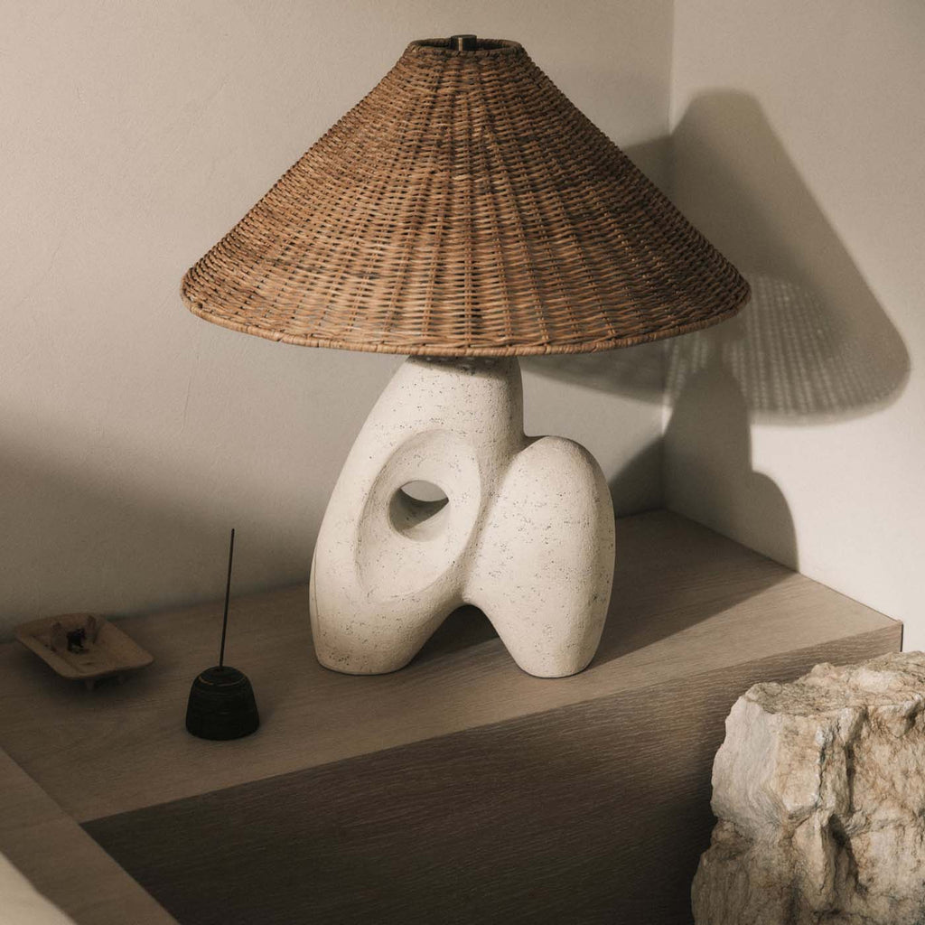 Taking inspiration from the rugged Moray coast in Scotland, the Troy Lighting Nairn table lamp is designed from a 3-D scan of a sculpture by Chandler McLellan. The asymmetric base stems from the artist’s appreciation for natural stones that lean, sometimes impossibly, against each other. Playing with positive and negative space, a distinctive cut-out accents one form, creating a moment of drama within the balanced composition. The oblong shapes are complemented by a natural wicker shade and French wiring. Part of our Chandler McLellan collection.
