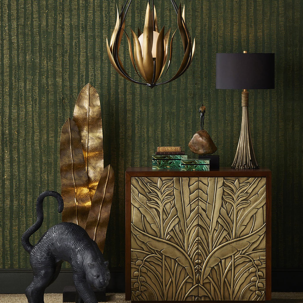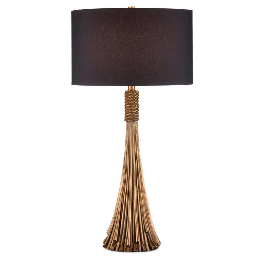 A beautiful representation of an interior ornamentation that rose to popularity during the early 17th century, the Currey & Co Baroque Table Lamp is shaped like a luxurious tassel. The convincing sense of movement it reflects is all the more impressive because it is made of aluminum. An antique brass finish and the black shade make their own statements within this luxe composition.